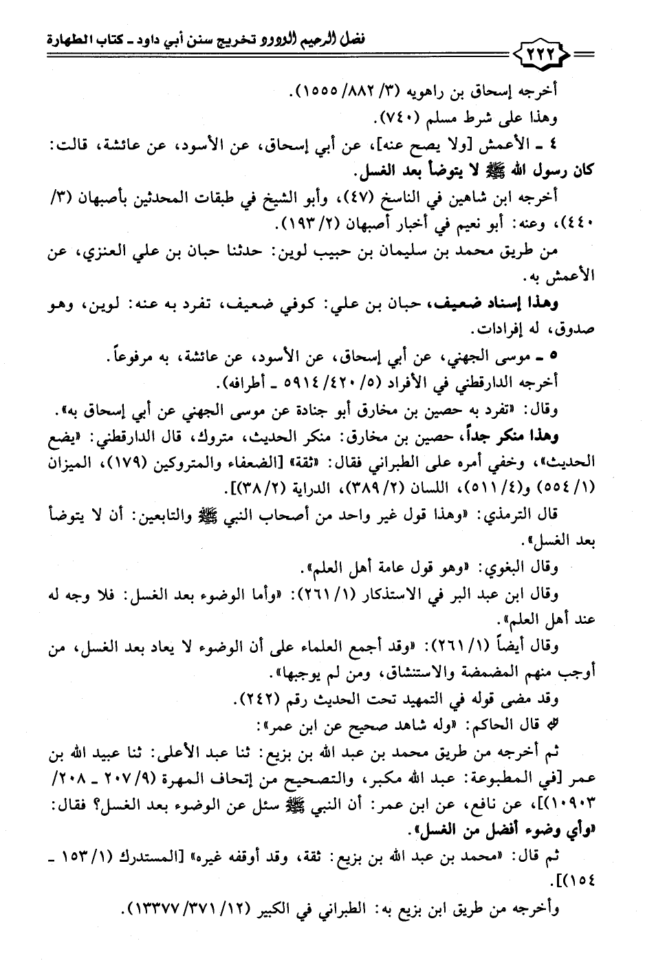 ٤ - الأعمش [ولا يصح عنه]، عن أبي إسحاق، عن الأسود، عن عائشة، قالت: كان رسول الله - صلى الله عليه وسلم - لا يتوضأ بعد الغسل.
