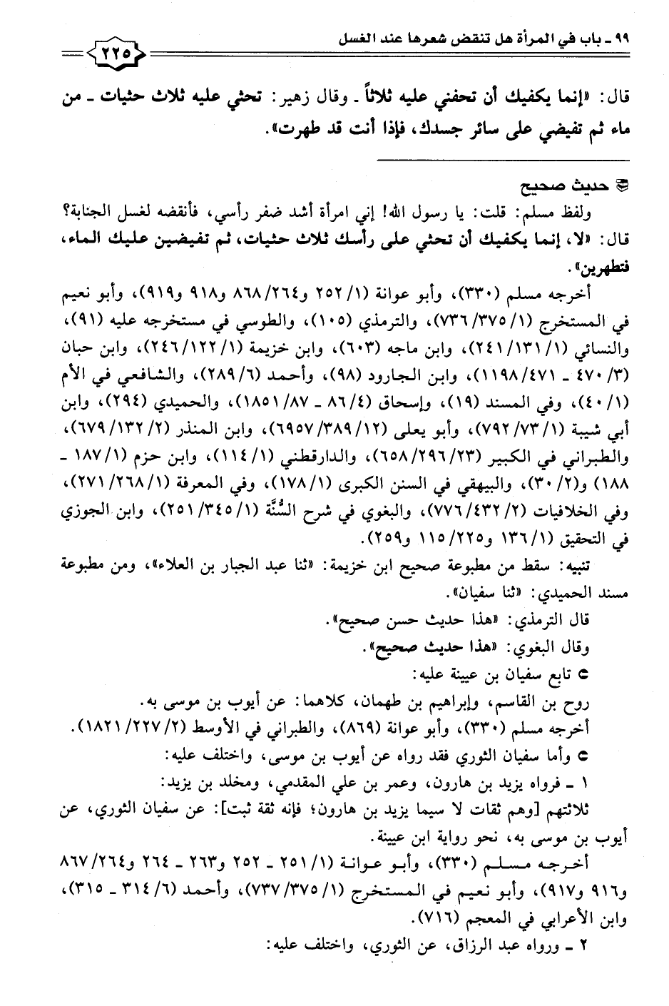 أخرجه مسلم (٣٣٠)، وأبو عوانة (١/ ٢٥٢ و ٢٦٤/ ٨٦٨ و ٩١٨ و ٩١٩)، وأبو نعيم في المستخرج (١/ ٣٧٥/ ٧٣٦)، والترمذي (١٠٥)، والطوسي في مستخرجه عليه (٩١)، والنسائي (١/ ١٣١/ ٢٤١)، وابن ماجة (٦٠٣)، وابن خزيمة (١/ ١٢٢/ ٢٤٦)، وابن حبان (٣/ ٤٧٠ - ٤٧١/ ١١٩٨)، وابن الجارود (٩٨)، وأحمد (٦/ ٢٨٩)، والشافعي في الأم (١/ ٤٠)، وفي المسند (١٩)، وإسحاق (٤/ ٨٦ - ٨٧/ ١٨٥١)، والحميدي (٢٩٤)، وابن أبي شيبة (١/ ٧٣/ ٧٩٢)، وأبو يعلى (١٢/ ٣٨٩/ ٦٩٥٧)، وابن المنذر (٢/ ١٣٢/ ٦٧٩)، والطبراني في الكبير (٢٣/ ٢٩٦/ ٦٥٨)، والدارقطني (١/ ١١٤)، وابن حزم (١/ ١٨٧ - ١٨٨) و (٢/ ٣٥)، والبيهقي في السنن الكبرى (١/ ١٧٨)، وفي المعرفة (١/ ٢٦٨/ ٢٧١)، وفي الخلافيات (٢/ ٤٣٢/ ٧٧٦)، والبغوي في شرح الكامَة (١/ ٣٤٥/ ٢٥١)، وابن. الجوزي في التحقيق (١/ ١٣٦ و ٢٢٥/ ١١٥ و ٢٥٩).