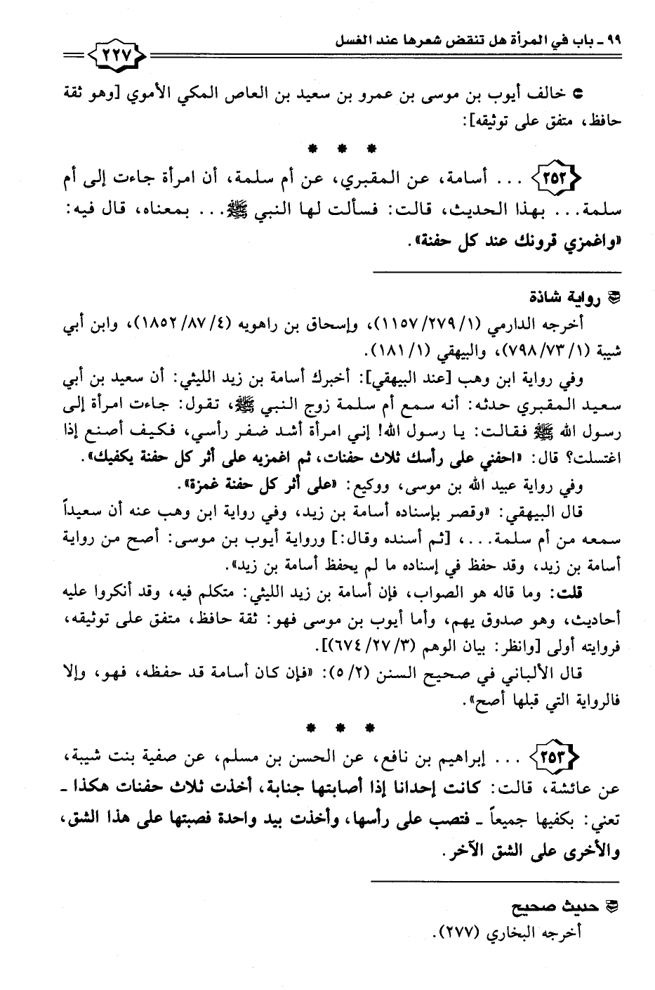 ٢٥٢ - . . . أسامة، عن المقبري، عن أم سلمة، أن امرأة جاءت إلى أم سلمة ... بهذا الحديث، قالت: فسألت لها النبي - صلى الله عليه وسلم - . . . بمعناه، قال فيه: "واغمزي قرونك عند كل حفنة".