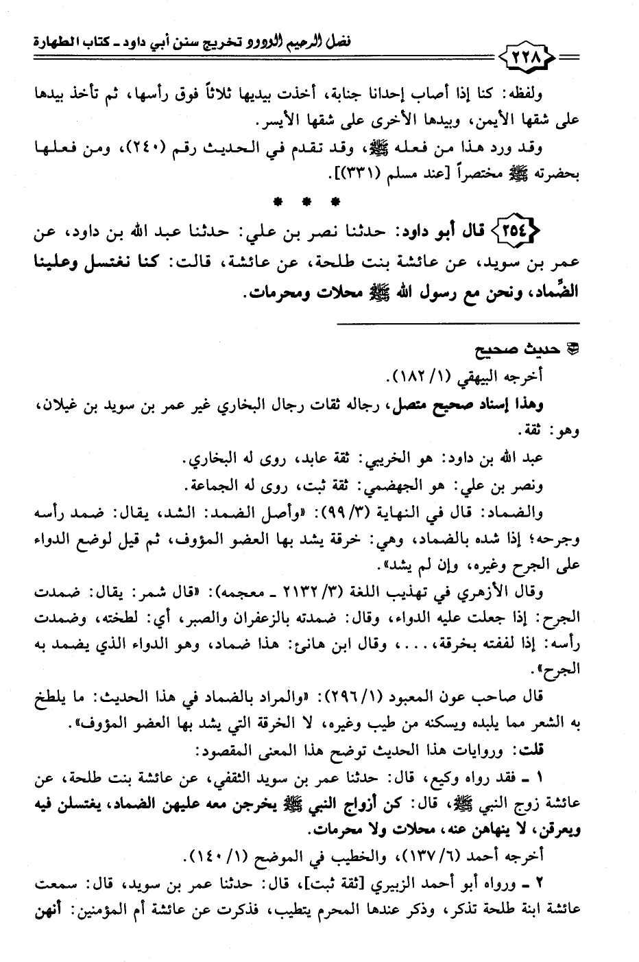 ٢٥٤ - قال أبو داود: حدثنا نصر بن علي: حدثنا عبد الله بن داود، عن عمر بن سويد، عن عائشة بنت طلحة، عن عائشة، قالت: كنا نغتسل وعلينا الضِّماد، ونحن مع رسول الله - صلى الله عليه وسلم - محلات ومحرمات.