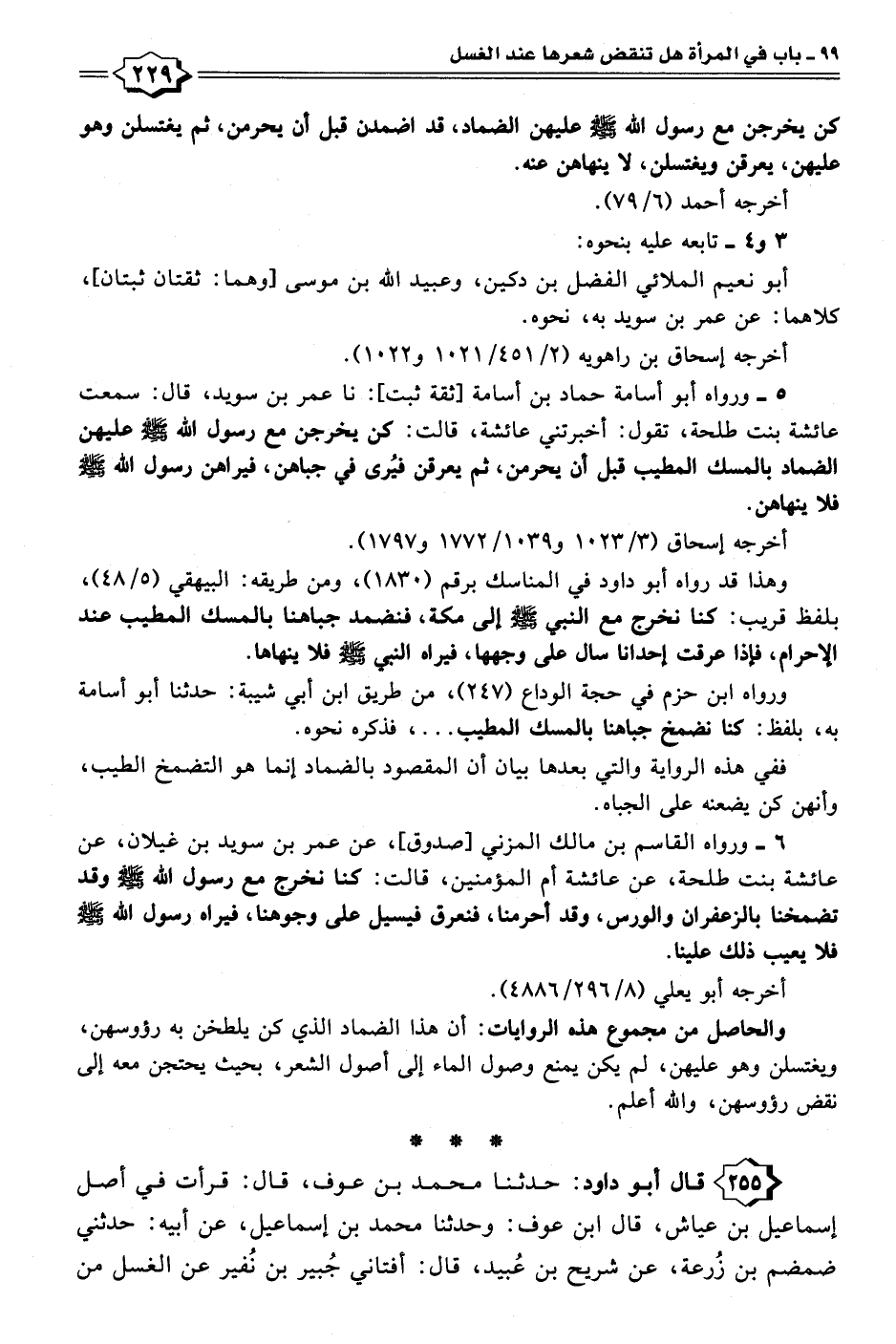 ٥ - ورواه أبو أسامة حماد بن أسامة [ثقة ثبت]: نا عمر بن سويد، قال: سمعت عائشة بنت طلحة، تقول: أخبرتني عائشة، قالت: كن يخرجن مع رسول الله - صلى الله عليه وسلم - عليهن الضماد بالمسك المطيب قبل أن يحرمن، ثم يعرقن فيُرى في جباهن، فيراهن رسول الله - صلى الله عليه وسلم - فلا ينهاهن.