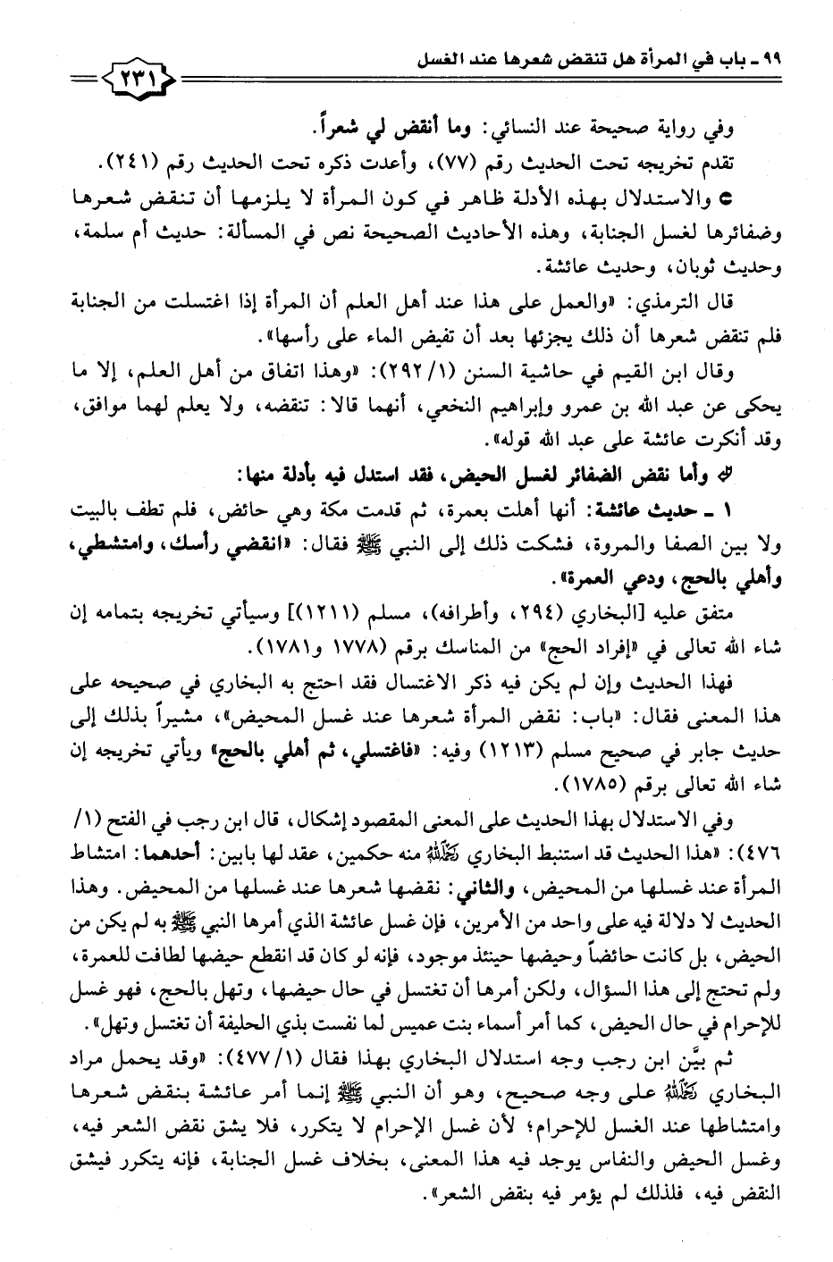 ثم بيَّن ابن رجب وجه استدلال البخاري بهذا فقال (١/ ٤٧٧): "وقد يحمل مراد البخاري - رَحِمَهُ اللهُ - على وجه صحيح، وهو أن النبي - صلى الله عليه وسلم - إنما أمر عائشة بنقض شعرها وامتشاطها عند الغسل للإحرام؛ لأنَّ غسل الإحرام لا يتكرر، فلا يشق نقض الشعر فيه، وغسل الحيض والنفاس يوجد فيه هذا المعنى، بخلاف غسل الجنابة، فإنه يتكرر فيشق النقض فيه، فلذلك لم يؤمر فيه بنقض الشعر".