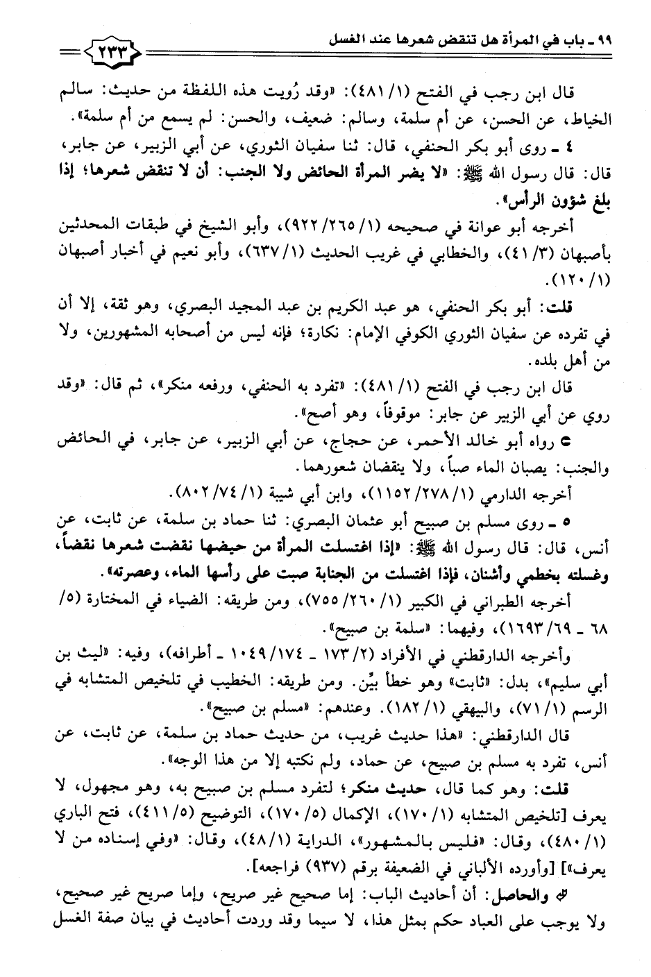 • والحاصل: أن أحاديث الباب: إما صحيح غير صريح، وإما صريح غير صحيح، ولا يوجب على العباد حكم بمثل هذا، لا سيما وقد وردت أحاديث في كان صفة الغسل