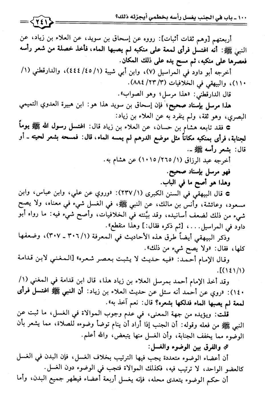 أربعتهم [وهم ثقات أثبات]: رووه عن إسحاق بن سويد، عن العلاء بن زياد، عن النبي - صلى الله عليه وسلم -: أنَّه اغتسل فرأى لمعة على منكبه لم يصبها الماء، فأخذ خصلة من شعر رأسه فعصرها على منكبه، ثم مسح يده على ذلك المكان.