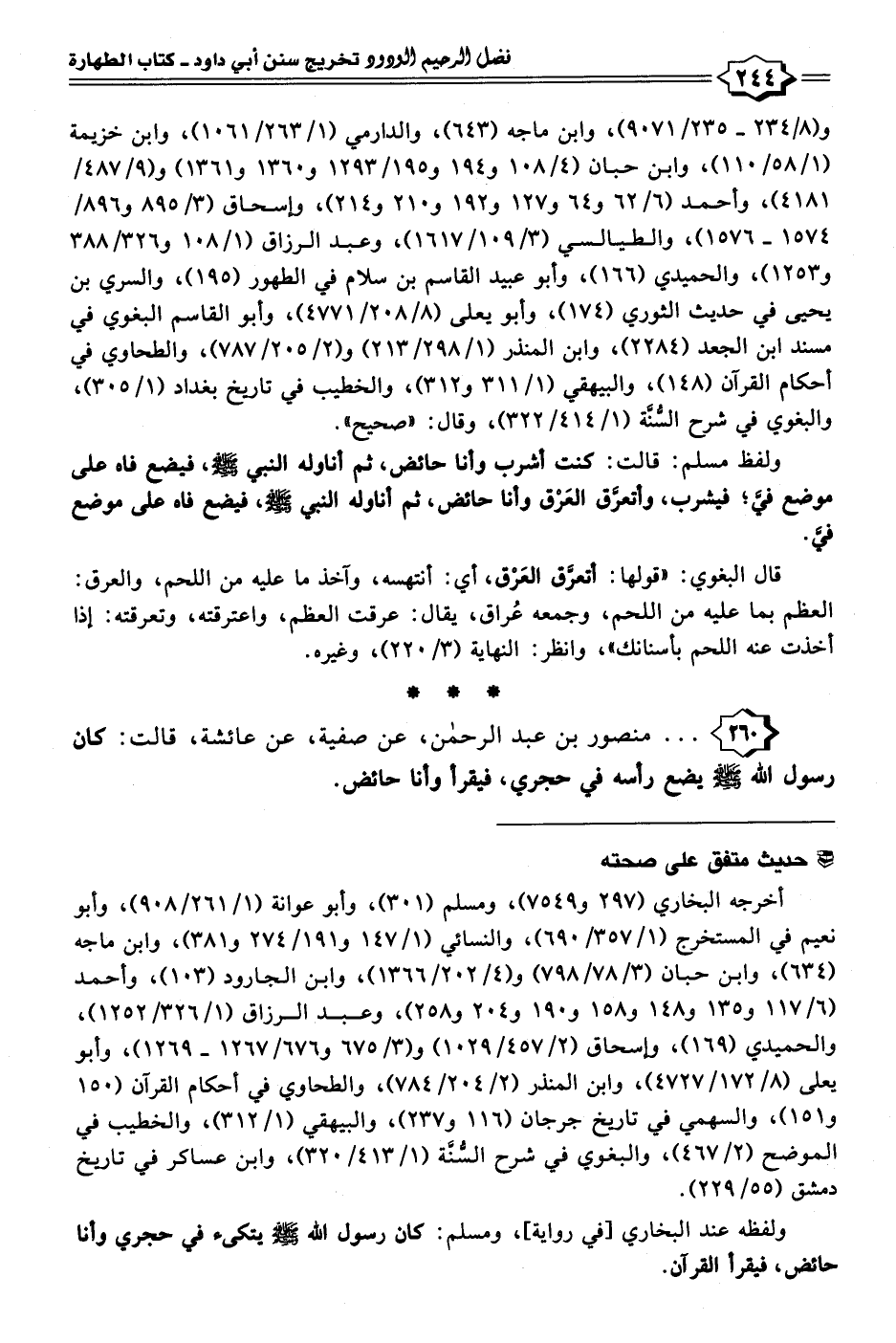 ٢٦٠ - . . . منصور بن عبد الرحمن، عن صفية، عن عائشة، قالت: كان رسول الله - صلى الله عليه وسلم - يضع رأسه في حجري، فيقرأ وأنا حائض.