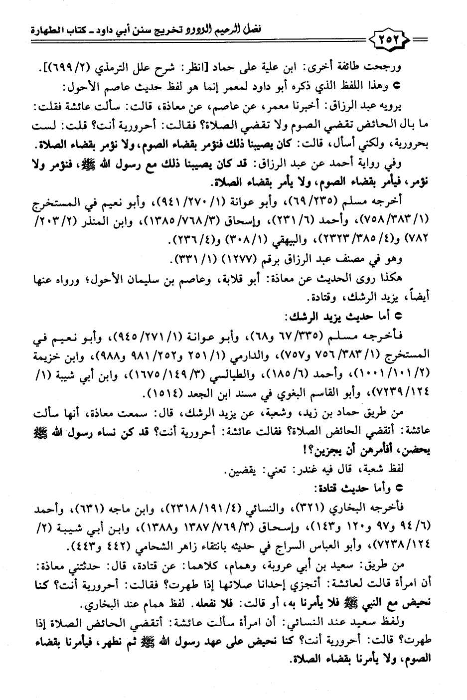 من طريق: سعيد بن أبي عروبة، وهمام، كلاهما: عن قتادة، قال: حدثتني معاذة: أن امرأة قالت لعائشة: أتجزي إحدانا صلاتها إذا طهرت؟ فقالت: أحرورية أنت؟ كنا نحيض مع النبي - صلى الله عليه وسلم - فلا يأمرنا به، أو قالت: فلا نفعله. لفظ همام عند البخاري.