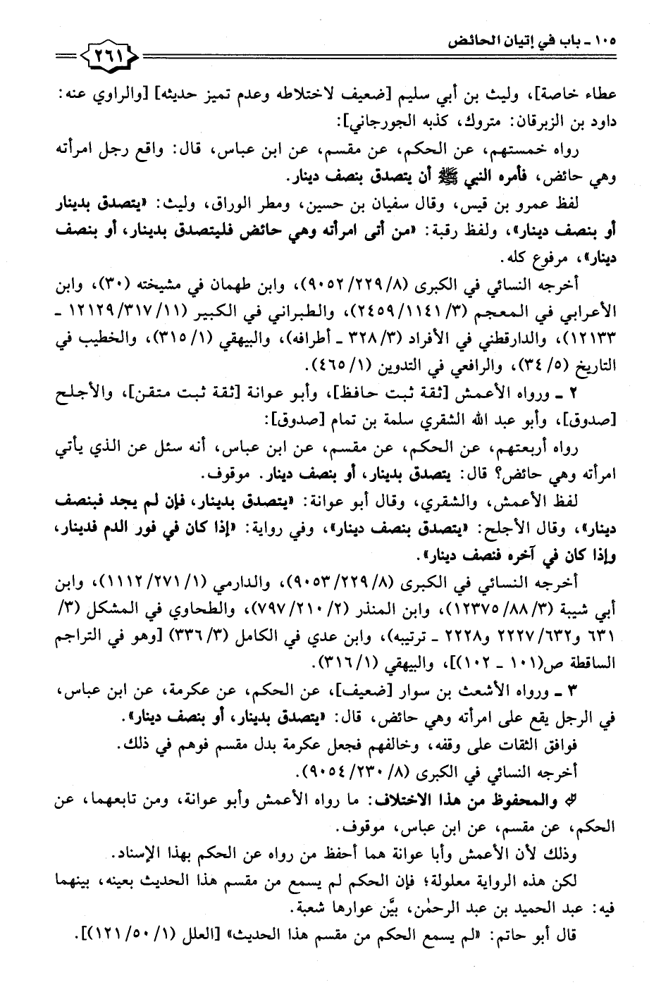 رواه أربعتهم، عن الحكم، عن مقسم، عن ابن عباس، أنَّه سئل عن الَّذي يأتي امرأته وهي حائض؟ قال: يتصدق بدينار، أو بنصف دينار. موقوف.