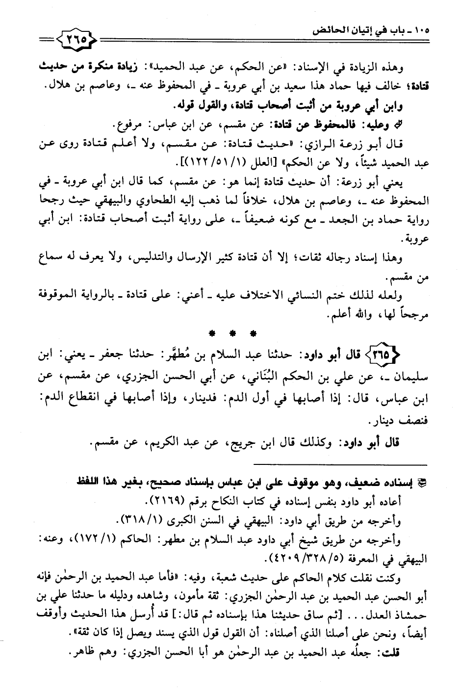 ٢٦٥ - قال أبو داود: حدثنا عبد السلام بن مُطهَّر: حدثنا جعفر -يعني: ابن سليمان-، عن علي بن الحكم البُنَاني، عن أبي الحسن الجزري، عن مقسم، عن ابن عباس، قال: إذا أصابها في أول الدم: فدينار، وإذا أصابها في انقطاع الدم: فنصف دينار.