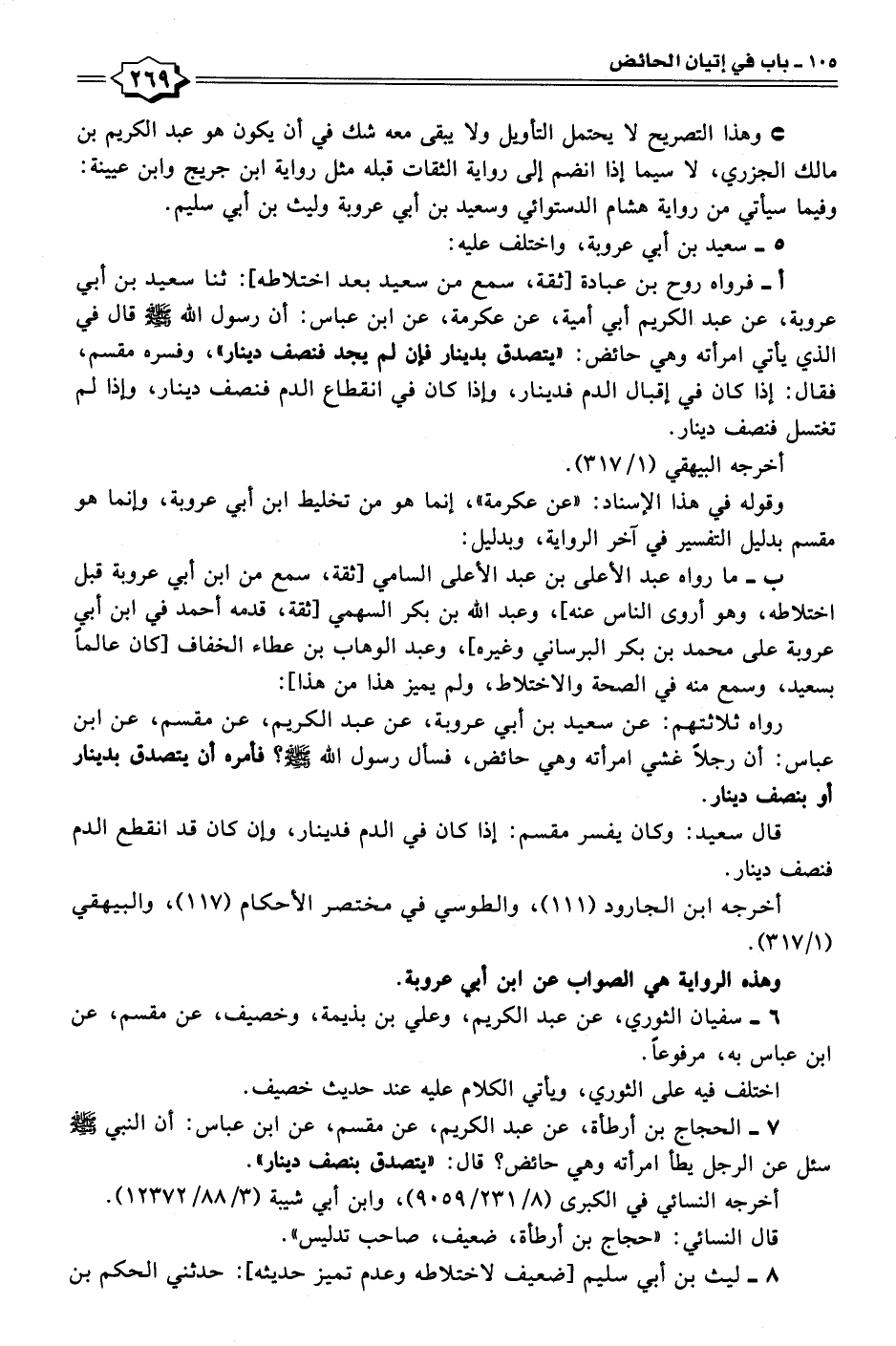 أ - فرواه روح بن عبادة [ثقة، سمع من سعيد بعد اختلاطه]: ثنا سعيد بن أبي عروبة، عن عبد الكريم أبي أمية، عن عكرمة، عن ابن عباس: أن رسول الله - صلى الله عليه وسلم - قال في الَّذي يأتي امرأته وهي حائض: "يتصدق بدينار فإن لم يجد فنصف دينار"، وفسره مقسم، فقال: إذا كان في إقبال الدم فدينار، وإذا كان في انقطاع الدم فنصف دينار، وإذا لم تغتسل فنصف دينار.