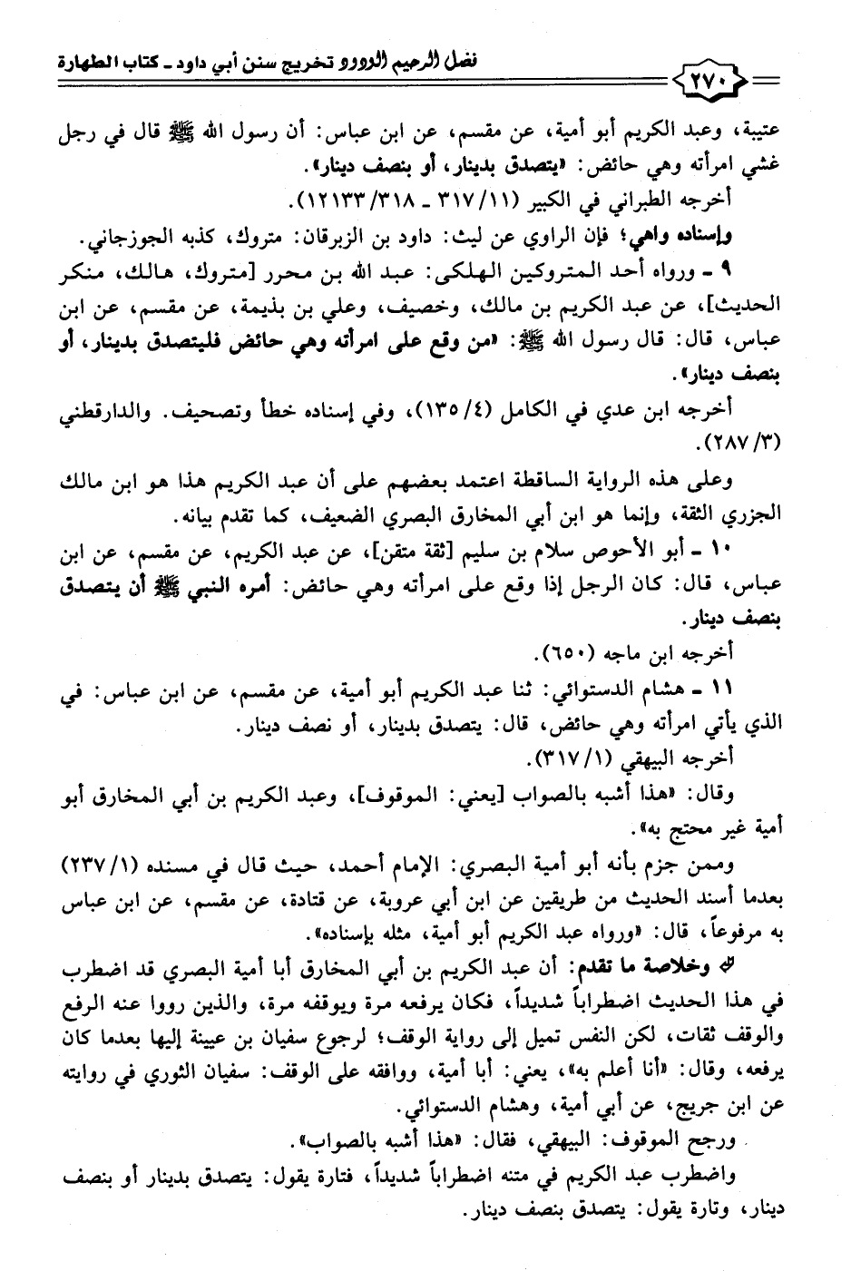 ٩ - ورواه أحد المتروكين الهلكى: عبد الله بن محرر [متروك، هالك، منكر الحديث]، عن عبد الكريم بن مالك، وخصيف، وعلي بن بذيمة، عن مقسم، عن ابن عباس، قال: قال رسول الله - صلى الله عليه وسلم -: "من وقع على امرأته وهي حائض فليتصدق بدينار، أو بنصف دينار".