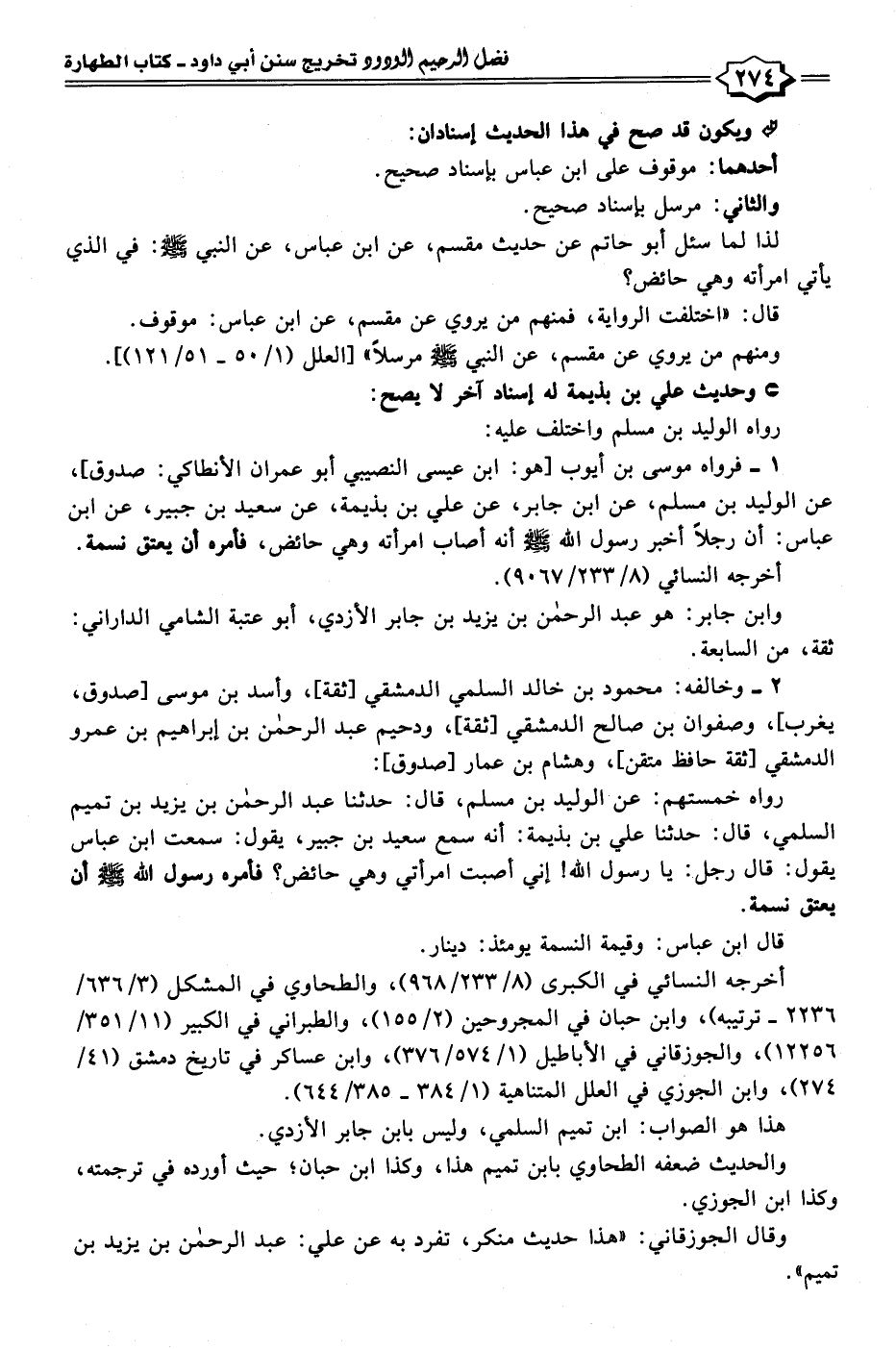 رواه خمستهم: عن الوليد بن مسلم، قال: حدثنا عبد الرحمن بن يزيد بن تميم السلمي، قال: حدثنا علي بن بذيمة: أنَّه سمع سعيد بن جبير، يقول: سمعت ابن عباس يقول: قال رجل: يا رسول الله! إني أصبت امرأتي وهي حائض؟ فأمره رسول الله - صلى الله عليه وسلم - أن يعتق نسمة.