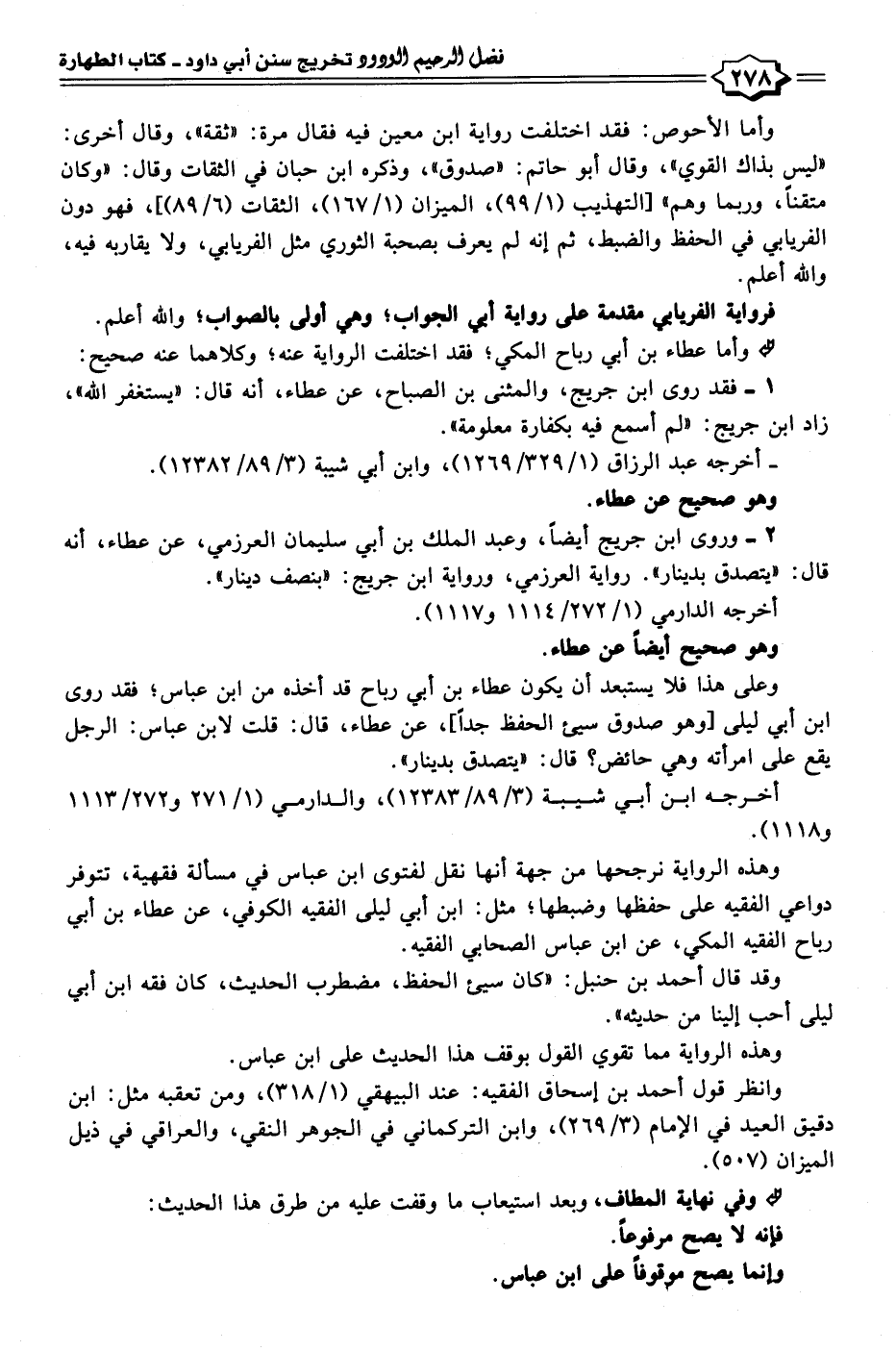وعلى هذا فلا يستبعد أن يكون عطاء بن أبي رباح قد أخذه من ابن عباس؛ فقد روى ابن أبي ليلى [وهو صدوق سيئ الحفظ جدًّا]، عن عطاء، قال: قلت لابن عباس: الرجل يقع على امرأته وهي حائض؟ قال: "يتصدق بدينار".