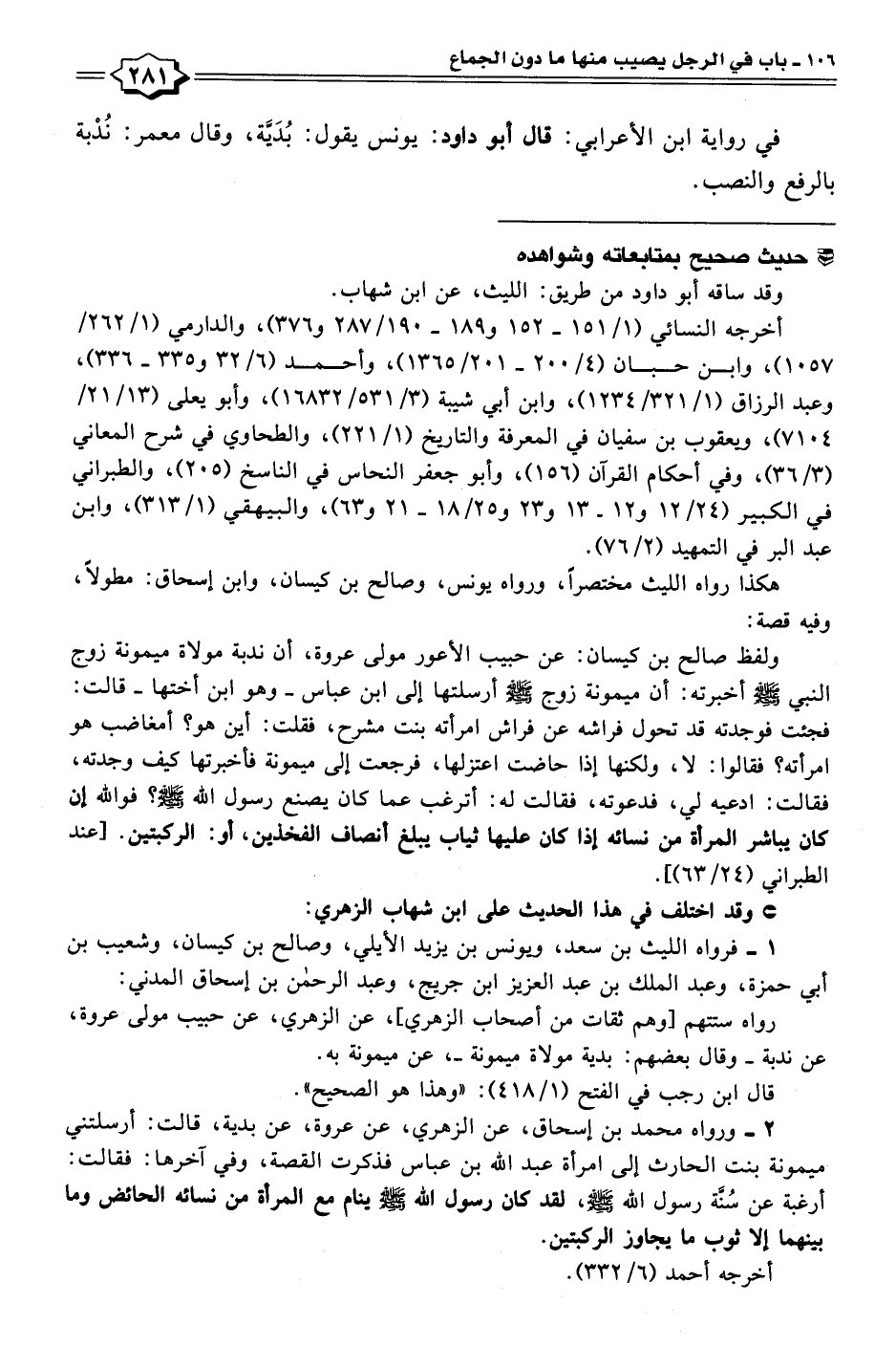 ولفظ صالح بن كيسان: عن حبيب الأعور مولى عروة، أن ندبة مولاة ميمونة زوج النبي - صلى الله عليه وسلم - أخبرته: أن ميمونة زوج النبي - صلى الله عليه وسلم - أرسلتها إلى ابن عباس -وهو ابن أختها- قالت: فجئت فوجدته قد تحول فراشه عن فراش امرأته بنت مشرح، فقلت: أين هو؟ أمغاضب هو امرأته؟ فقالوا: لا، ولكنها إذا حاضت اعتزلها، فرجعت إلى ميمونة فأخبرتها كيف وجدته، فقالت: ادعيه لي، فدعوته، فقالت له: أترغب عما كان يصنع رسول الله - صلى الله عليه وسلم -؟ فوالله إن كان يباشر المرأة من نسائه إذا كان عليها ثياب يبلغ أنصاف الفخدين، أو: الركبتين. [عند الطبراني (٢٤/ ٦٣)].