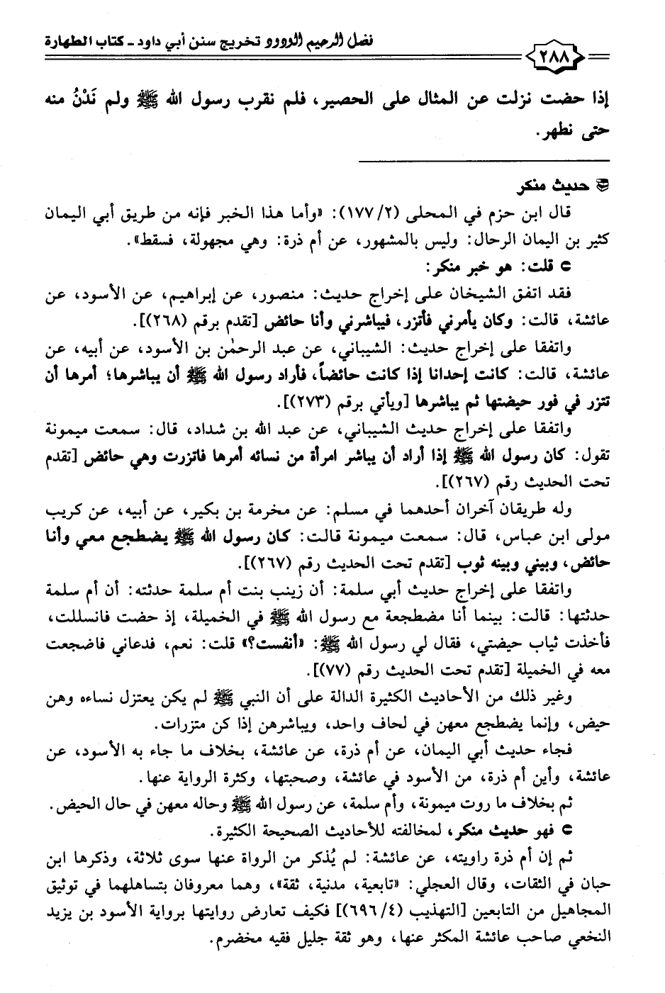 وغير ذلك من الأحاديث الكثيرة الدالة على أن النبي - صلى الله عليه وسلم - لم يكن يعتزل نساءه وهن حيض، وإنما يضطجع معهن في لحاف واحد، ويباشرهن إذا كن متزرات.