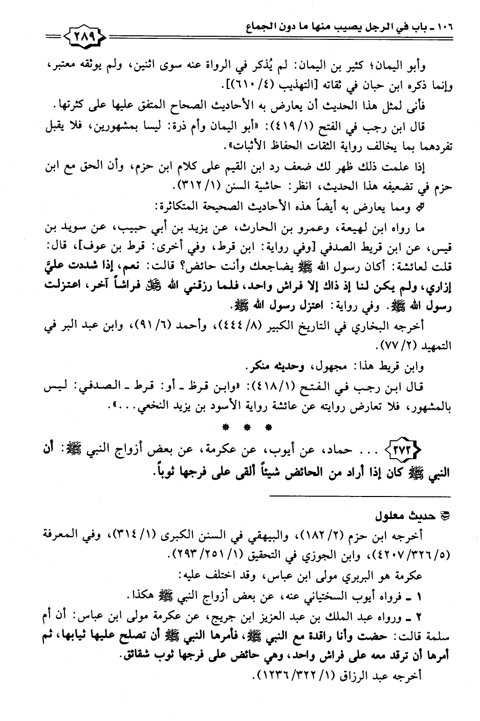 ٢ - ورواه عبد الملك بن عبد العزيز ابن جريج، عن عكرمة مولى ابن عباس: أن أم سلمة قالت: حضت وأنا راقدة مع النبي - صلى الله عليه وسلم -، فأمرها النبي - صلى الله عليه وسلم - أن تصلح عليها ثيابها، ثم أمرها أن ترقد معه على فراش واحد، وهي حائض على فرجها ثوب شقائق.
