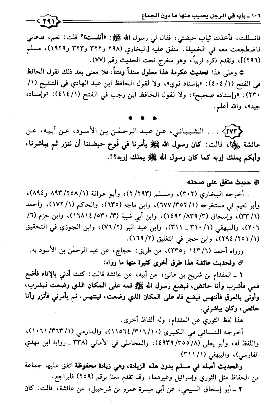 ٢٧٣ - الشيباني، عن عبد الرحمن بن الأسود، عن أبيه، عن عائشة - رضي الله عنها -، قالت: كان رسول الله - صلى الله عليه وسلم - يأمرنا في فَوح حيضتنا أن نتزر ثم يباشرنا، وأيكم يملك إربه كما كان رسول الله - صلى الله عليه وسلم - يملك إربه؟!.