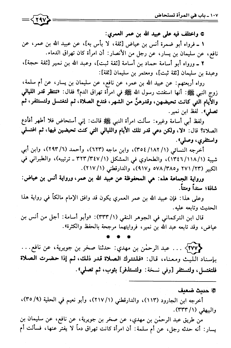 ١ - فرواه أبو ضمرة أَنس بن عياض [ثقة، لا بأس به]، عن عبيد الله بن عمر، عن نافع، عن سليمان بن يسار، عن رجل من الأنصار: أن امرأة كان تهراق الدماء.
