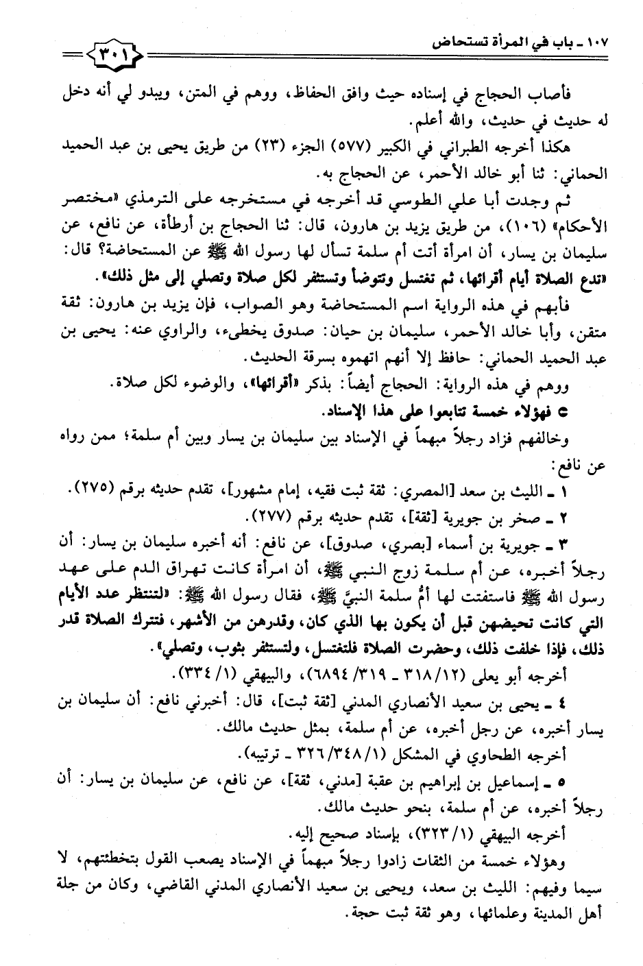 ٣ - جويرية بن أسماء [بصري، صدوق]، عن نافع: أنَّه أخبره سليمان بن يسار: أن رجلًا أخبره، عن أم سلمة زوج النبي - صلى الله عليه وسلم -، أن امرأة كانت تهراق الدم على عهد رسول الله - صلى الله عليه وسلم - فاستفتت لها أم سلمة النبي - صلى الله عليه وسلم -، فقال رسول الله - صلى الله عليه وسلم -: "لتنتظر عدد الأيام النبي كانت تحيضهن قبل أن يكون بها الذي كان، وقدرهن من الأشهر، فتترك الصلاة قدر ذلك، فإذا خلفت ذلك، وحضرت الصلاة فلتغتسل، ولتستثفر بثوب، وتصلي".