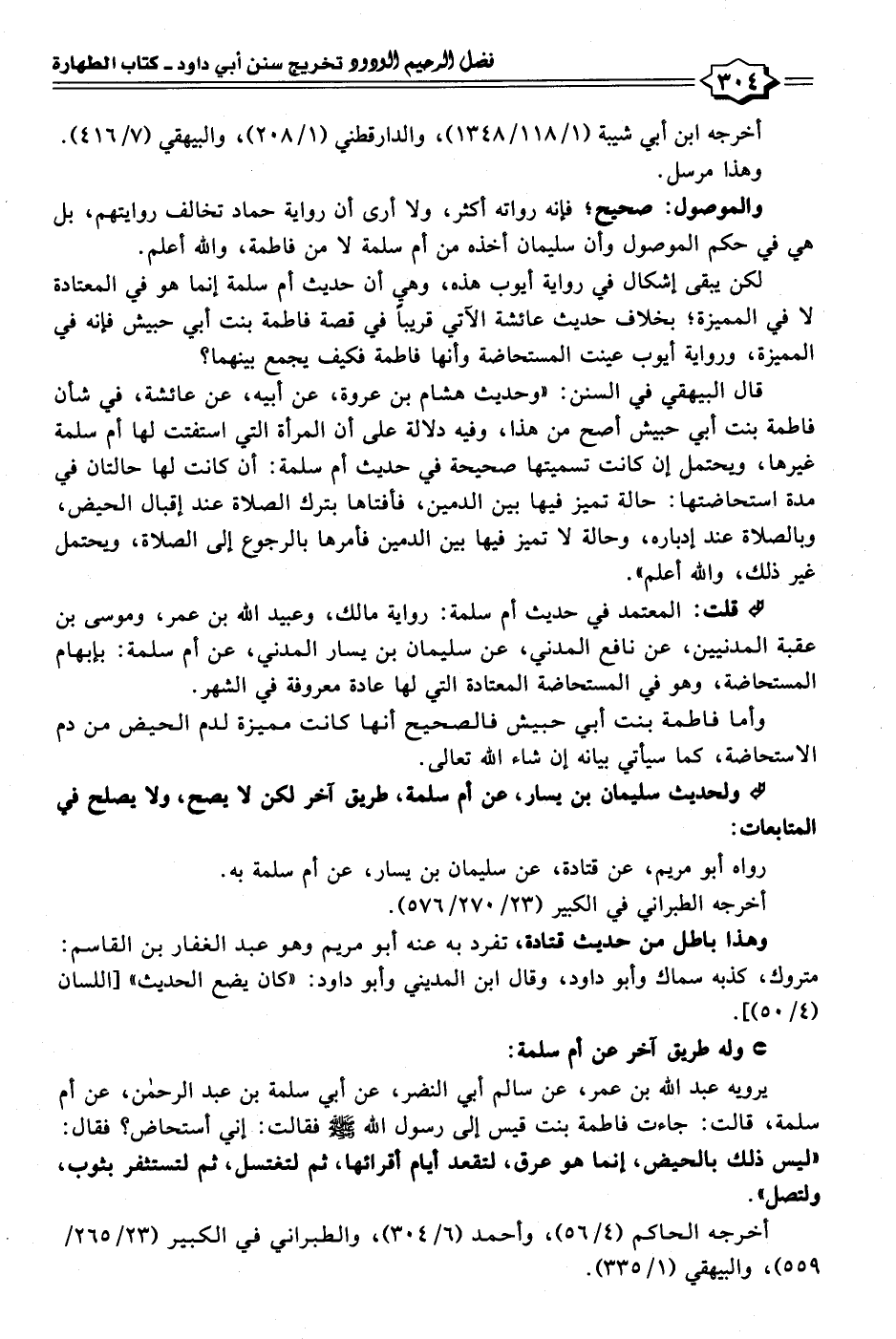 قال البيهقي في السنن: "وحديث هشام بن عروة، عن أبيه، عن عائشة، في شأن فاطمة بنت أبي حبيش أصح من هذا، وفيه دلالة على أن المرأة التي استفتت لها أم سلمة غيرها، ويحتمل إن كانت تسميتها صحيحة في حديث أم سلمة: أن كانت لها حالتان في مدة استحاضتها: حالة تميز فيها بين الدمين، فأفتاها بترك الصلاة عند إقبال الحيض، وبالصلاة عند إدباره، وحالة لا تميز فيها بين الدمين فأمرها بالرجوع إلى الصلاة، ويحتمل غير ذلك، والله أعلم".