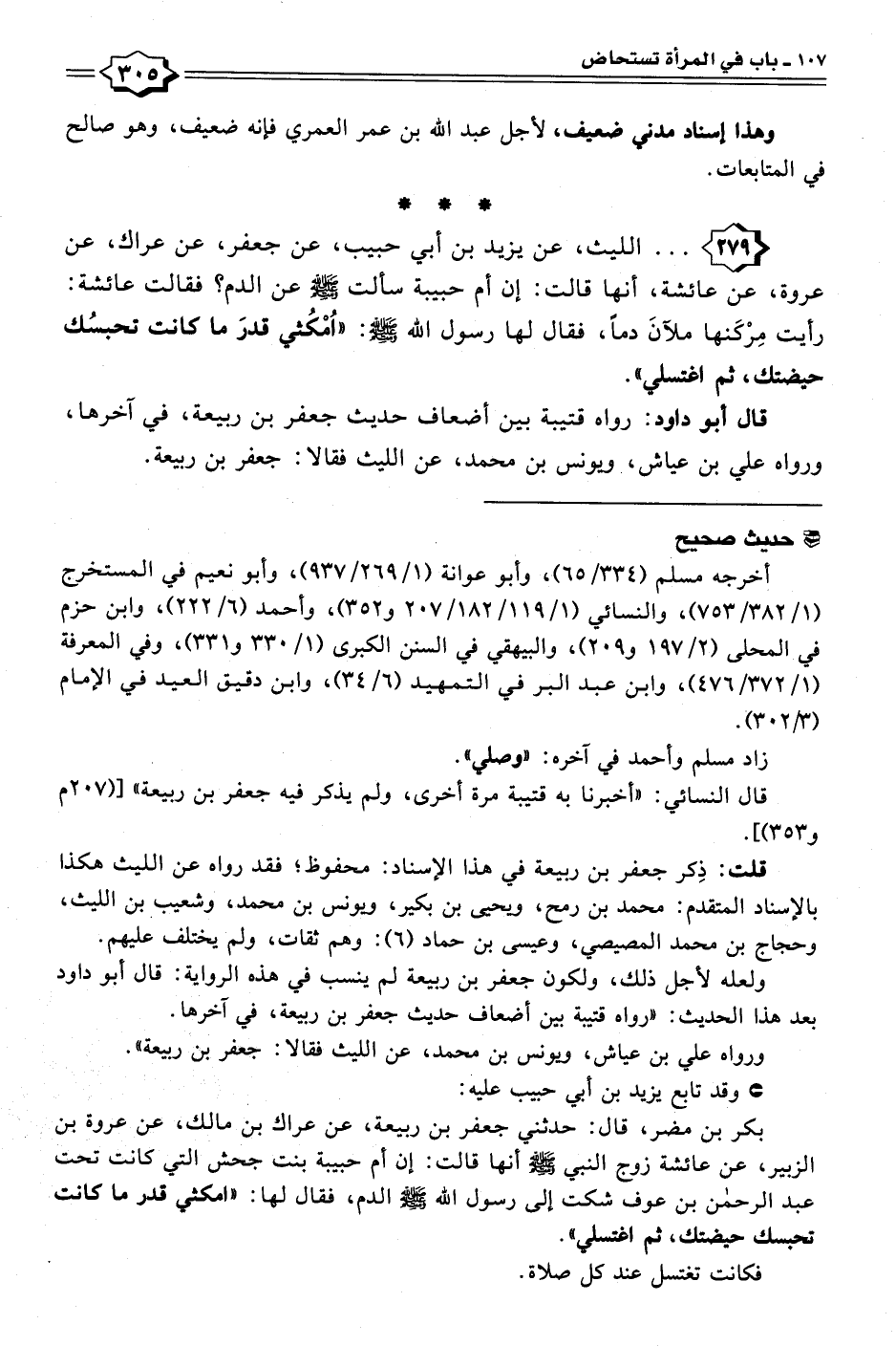 بكر بن مضر، قال: حدثني جعفر بن ربيعة، عن عراك بن مالك، عن عروة بن الزبير، عن عائشة زوج النبي - صلى الله عليه وسلم - أنها قالت: إن أم حبيبة بنت جحش التي كانت تحت عبد الرحمن بن عوف شكت إلى رسول الله - صلى الله عليه وسلم - الدم، فقال لها: "امكثي قدر ما كانت تحبسك حيضتك، ثم اغتسلي".