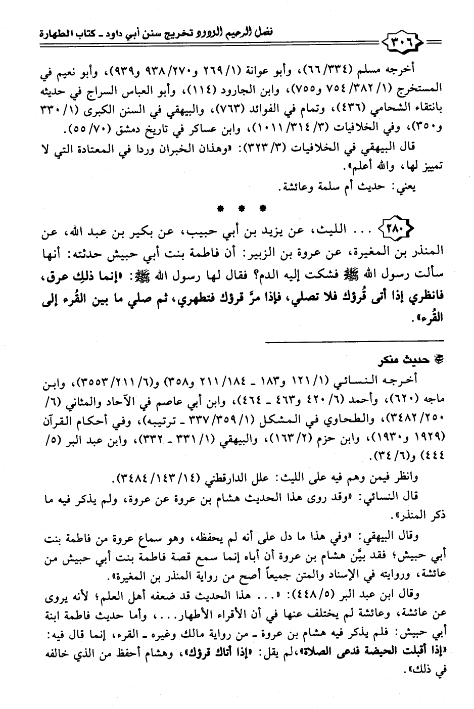 ٢٨٠ - . . . الليث، عن يزيد بن أبي حبيب، عن بكير بن عبد الله، عن المنذر بن المغيرة، عن عروة بن الزبير: أن فاطمة بنت أبي حبيش حدثته: أنها سألت رسول الله - صلى الله عليه وسلم - فشكت إليه الدم؟ فقال لها رسول الله - صلى الله عليه وسلم -: "إنما ذلكِ عرق، فانظري إذا أتى قُرؤك فلا تصلي، فإذا مرَّ قرؤك فتطهري، ثم صلي ما بين القُرء إلى القُرء".