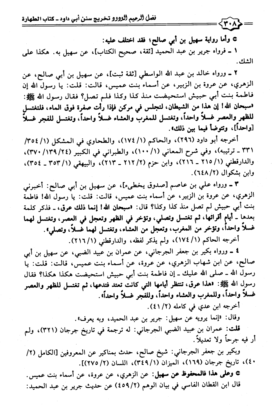 ٣ - ورواه علي بن عاصم [صدوق يخطئ]، عن سهيل بن أبي صالح: أخبرني الزهري، عن عروة بن الزبير، عن أسماء بنت عميس، قالت: قلت: يا رسول الله! فاطمة بنت أبي حبيش لم تصل منذ كذا وكذا؟ قال: "سبحان الله! إنما ذلك عرق، - فذكر كلمة بعدها - أيام أقرائها، ثم تغتسل وتصلي، وتؤخر في الظهر وتعجل في العصر، وتغتسل لهما غسلًا واحدا، وتؤخر من المغرب، وتعجل من العشاء، وتغتسل لهما غسلًا، وتصلي".
