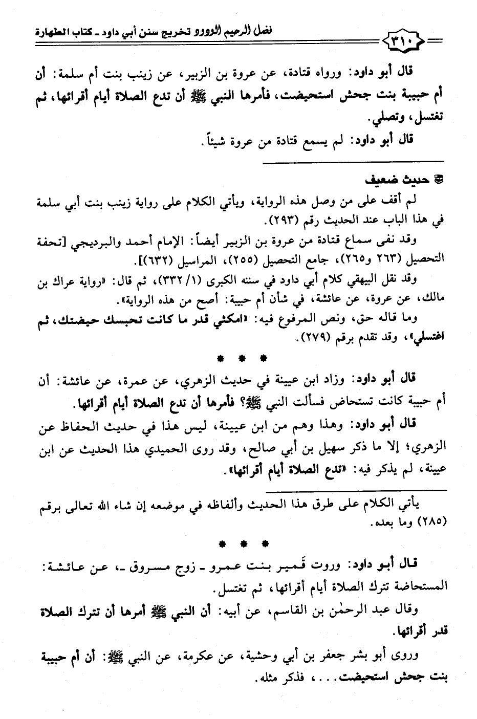 قال أبو داود: وزاد ابن عيينة في حديث الزهري، عن عمرة، عن عائشة: أن أم حبيبة كانت تستحاض فسألت النبي - صلى الله عليه وسلم -؛ فأمرها أن تدع الصلاة أيام أقرائها.