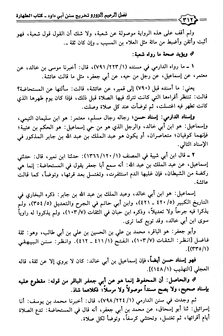 ٢ - قال ابن أبي شيبة في المصنف (١/ ١٢٠ / ١٣٦٦): حدثنا ابن نمير، قال: حدثني إسماعيل، عن عبد الملك بن عبد الله: أنَّه سمع أبا جعفر يقول في المستحاضة: إنما هي ركضة من الشيطان، فإن غلبها الدم استثفرت، وتغتسل بعد قرئها، وتوضأ، كما قالت عائشة.
