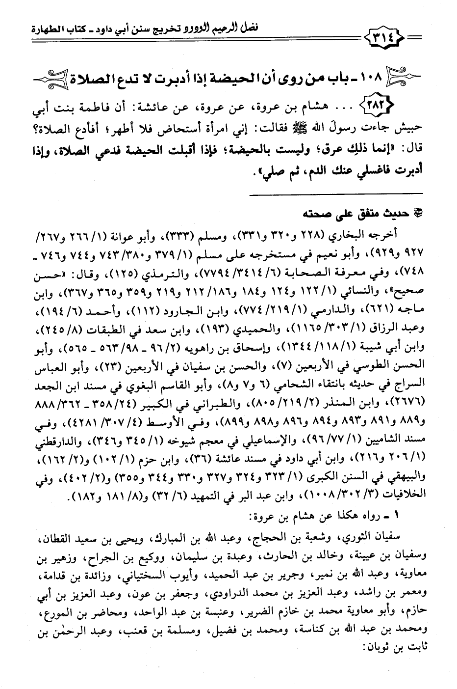 ٢٨٢ - . . . هشام بن عروة، عن عروة، عن عائشة: أن فاطمة بنت أبي حبيش جاءت رسولَ الله - صلى الله عليه وسلم - فقالت: إني امرأة أستحاض فلا أطهر؛ أفدع الصلاة؟ قال: "إنما ذلكِ عرق؛ وليست بالحيضة؛ فإذا، أقبلت الحيضة فدعي الصلاة، وإذا أدبرت فاغسلي عنك الدم، ثم صلي".