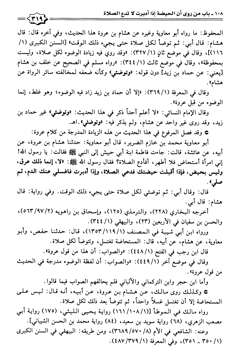 المحفوظ: ما رواه أبو معاوية وغيره عن هشام بن عروة هذا الحديث، وفي آخره قال: قال هشام: قال أبي: ثم توضأ لكل صلاة حتَّى يجيء ذلك الوقت" [السنن الكبرى (١/ ١١٦)]، وقال في موضع ثانٍ (١/ ٣٢٧): "وقد روي فيه زيادة الوضوء لكل صلاة، وليست بمحفوظة"، وقال في موضع ثالث (١/ ٣٤٤): "رواه مسلم في الصحيح عن خلف بن هشام [يعني: عن حماد بن زيد] دون قوله: "وتوضئي" وكأنه ضعفه لمخالفته سائر الرواة عن هشام".