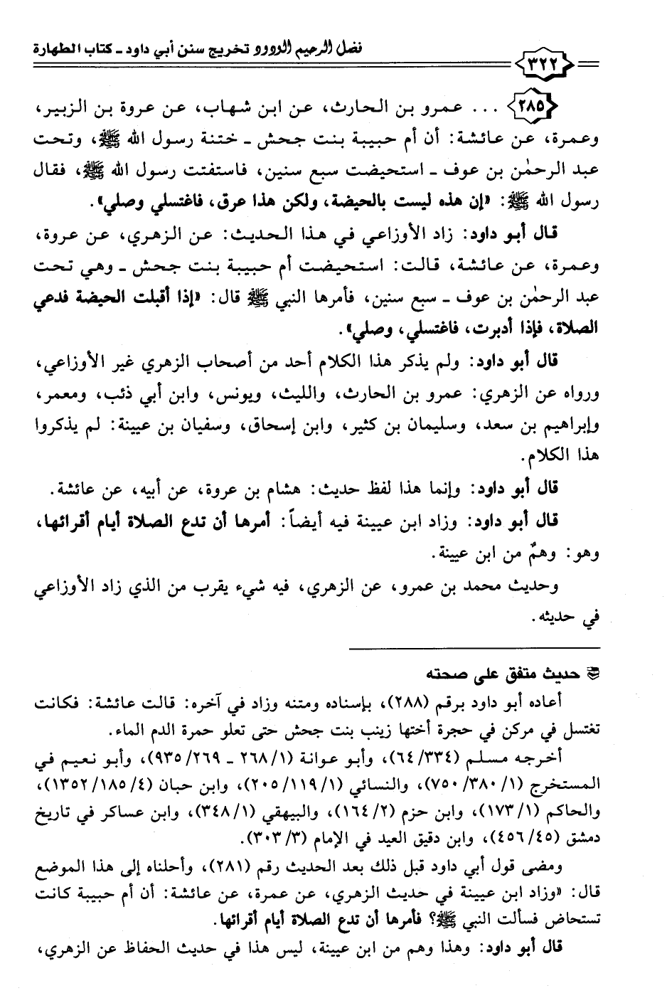 ومضى قول أبي داود قبل ذلك بعد الحديث رقم (٢٨١)، وأحلناه إلى هذا الموضع قال: "وزاد ابن عيينة في حديث الزهري، عن عمرة، عن عائشة: أن أم حبيبة كانت تستحاض فسألت النبي - صلى الله عليه وسلم -؟ فأمرها أن تدع الصلاة أيام أقرائها.