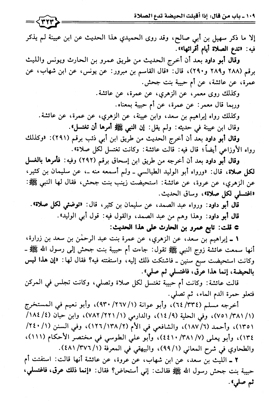 ١ - إبراهيم بن سعد، عن الزهري، عن عمرة بنت عبد الرحمن بن سعد بن زرارة، أنها سمعت عائشة زوج النبي - صلى الله عليه وسلم - تقول: جاءت أم حبيبة بنت جحش إلى رسول الله - صلى الله عليه وسلم - وكانت استحيضت سبع سنين - فاشتكت ذلك إليه، واستفتته فيه؟ فقال لها: "إن هذا ليس بالحيضة، إنما هذا عرق، فاغتسلي ثم صلي".