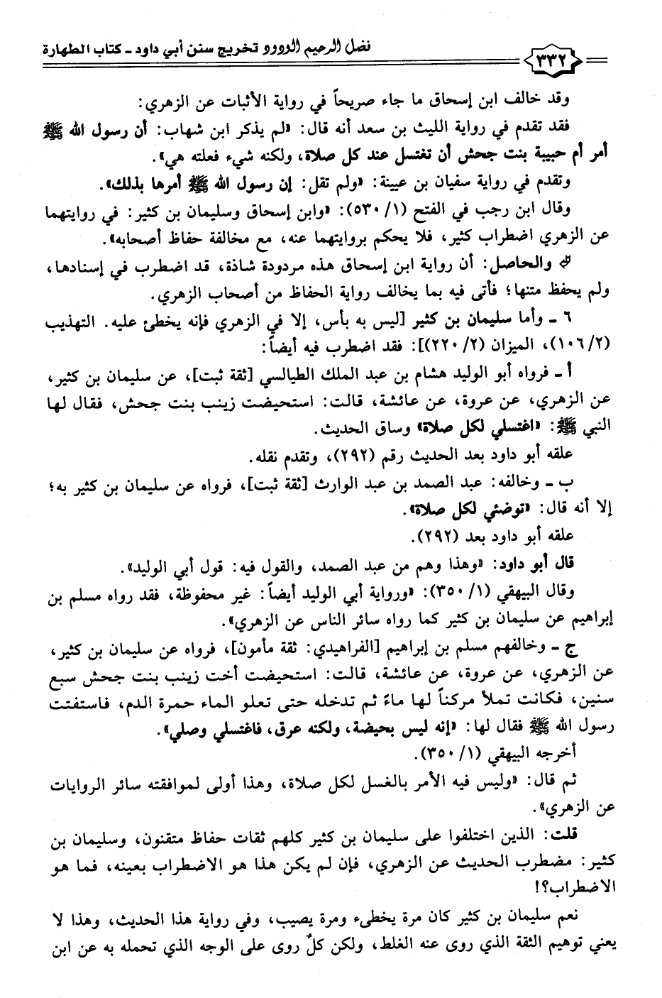 ج - وخالفهم مسلم بن إبراهيم [الفراهيدي: ثقة مأمون]، فرواه عن سليمان بن كثير، عن الزهري، عن عروة، عن عائشة، قالت: استحيضت أخت زينب بنت جحش سبع سنين، فكانت تملأ مركنًا لها ماءً ثم تدخله حتَّى تعلو الماء حمرة الدم، فاستفتت رسول الله - صلى الله عليه وسلم - فقال لها: "إنه ليس بحيضة، ولكنه عرق، فاغتسلي وصلي".