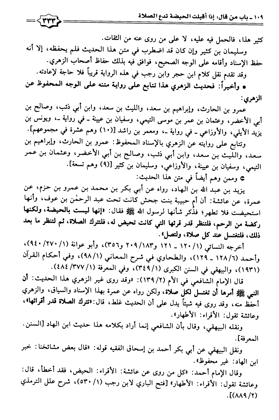 يزيد بن عبد الله بن الهاد، رواه عن أبي بكر بن محمد بن عمرو بن حزم، عن عمرة، عن عائشة: أن أم حبيبة بنت جحش كانت تحت عبد الرحمن بن عوف، وأنها استحيضت فلا تطهر؛ فذُكر شأنها لرسول الله - صلى الله عليه وسلم - فقال: "إنها ليست بالحيضة، ولكنها ركضة من الرحم، فلتنظر قدر قرئها التي كانت تحيض له، فلتترك الصلاة، ثم لتنظر ما بعد ذلك، فلتغتسل عند كل صلاة، ولتصل".