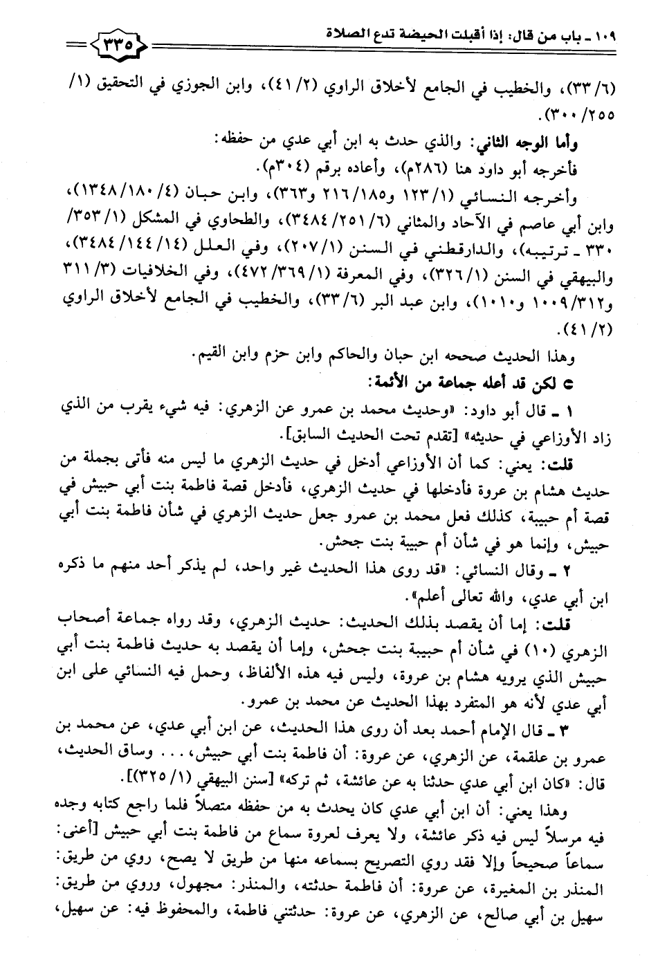 قلت: إما أن يقصد بذلك الحديث: حديث الزهري، وقد رواه جماعة أصحاب الزهري (١٠) في شأن أم حبيبة بنت جحش، وإما أن يقصد به حديث فاطمة بنت أبي حبيش الَّذي يرويه هشام بن عروة، وليس فيه هذه الألفاظ، وحمل فيه النسائي على ابن أبي عدي لأنَّه هو المتفرد بهذا الحديث عن محمد بن عمرو.