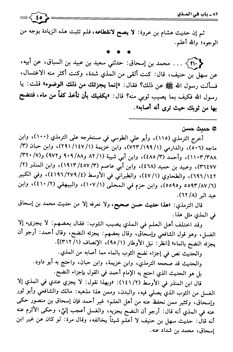قال الترمذي: "هذا حديث حسن صحيح، ولا نعرفه إلا من حديث محمد بن إسحاق في المذي مثل هذا.