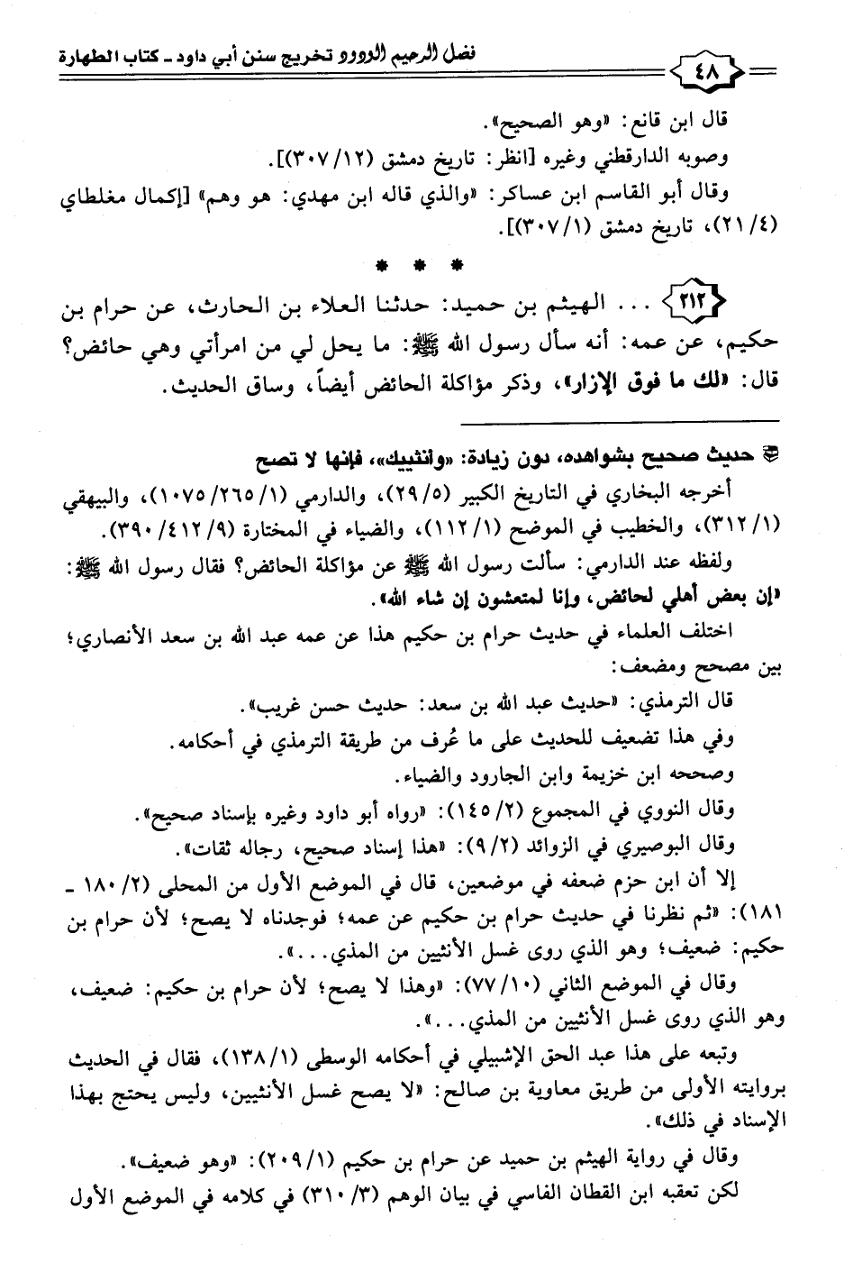 ٢١٢ - . . . الهيثم بن حميد: حدثنا العلاء بن الحارث، عن حرام بن حكيم، عن عمه: أنه سأل رسول الله - صلى الله عليه وسلم -: ما يحل لي من امرأتي وهى حائض؟ قال: "لك ما فوق الإزار"، وذكر مؤاكلة الحائض أيضًا، وساق الحديث.