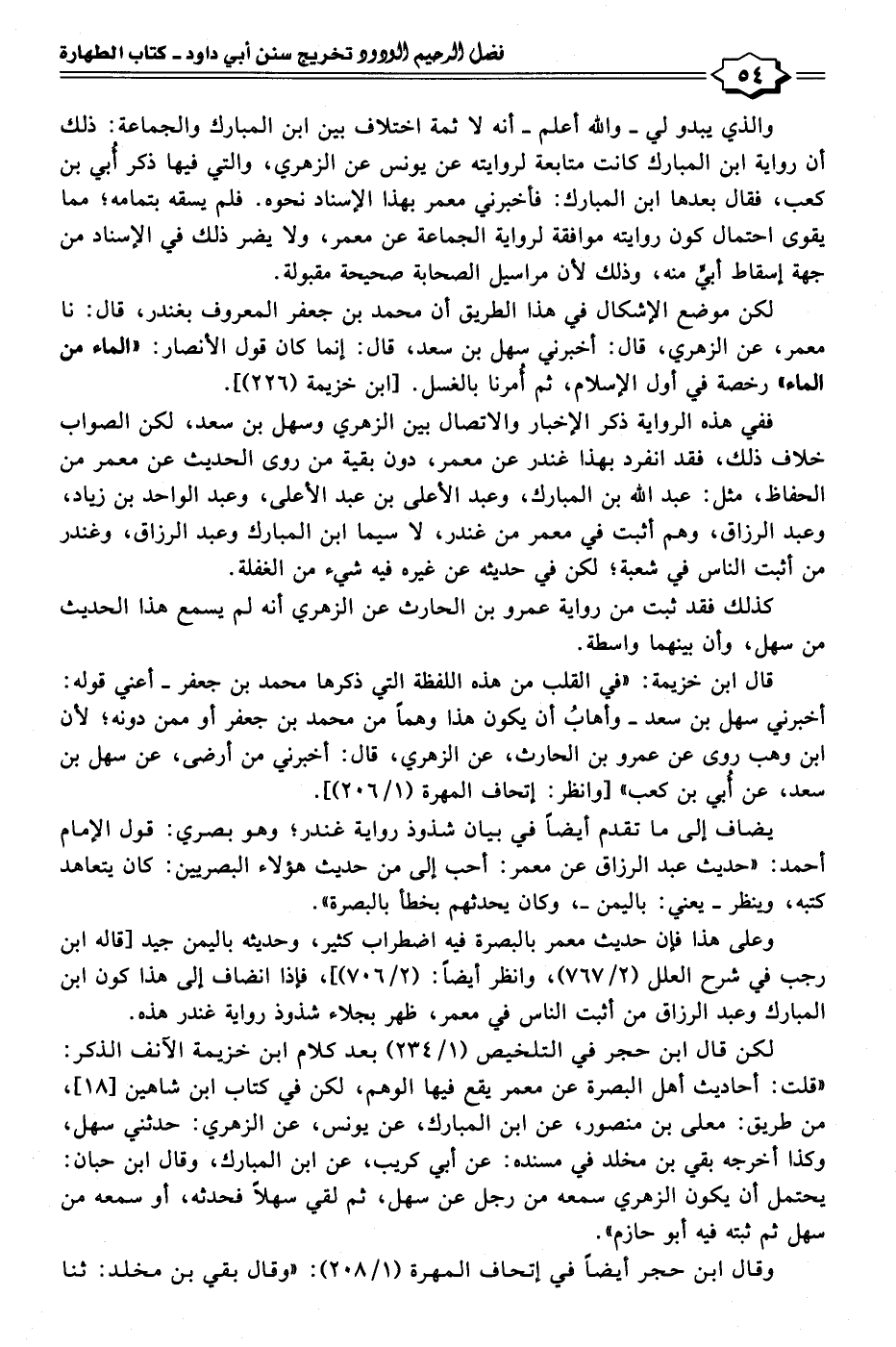 لكن قال ابن حجر في التلخيص (١/ ٢٣٤) بعد كلام ابن خزيمة الآنف الذكر: "قلت: أحاديث أهل البصرة عن معمر يقع فيها الوهم، لكن في كتاب ابن شاهين [١٨]، من طريق: معلى بن منصور، عن ابن المبارك، عن يونس، عن الزهري: حدثني سهل، وكذا أخرجه بقي بن مخلد في مسنده: عن أبي كريب، عن ابن المبارك، وقال ابن حبان: يحتمل أن يكون الزهري سمعه من رجل عن سهل، ثم لقي سهلًا فحدثه، أو سمعه من سهل ثم ثبته فيه أبو حازم".