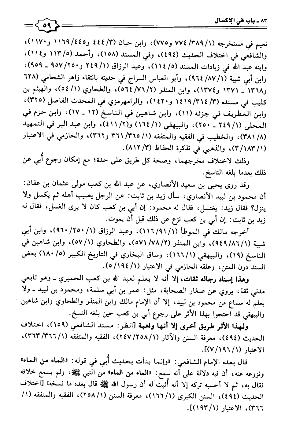 قال بعده الإمام الشافعي: "وإنما بدأت بحديث أُبي في قوله: "الماء من الماء" ونزوعه عنه، أن فيه دلالة على أنه سمع: "الماء من الماء" من النبي - صلى الله عليه وسلم -، ولم يسمع خلافه فقال به، ثم لا أحسبه تركه إلا أنه أُثبت له أن رسول الله - صلى الله عليه وسلم - قال بعده ما نسخه" [اختلاف الحديث (٤٩٤)، السنن الكبرى (١/ ١٦٦)، معرفة السنن (١/ ٢٥٨)، الفقيه والمتفقه (١/ ٣٦٦)، الاعتبار (١/ ١٩٣)].