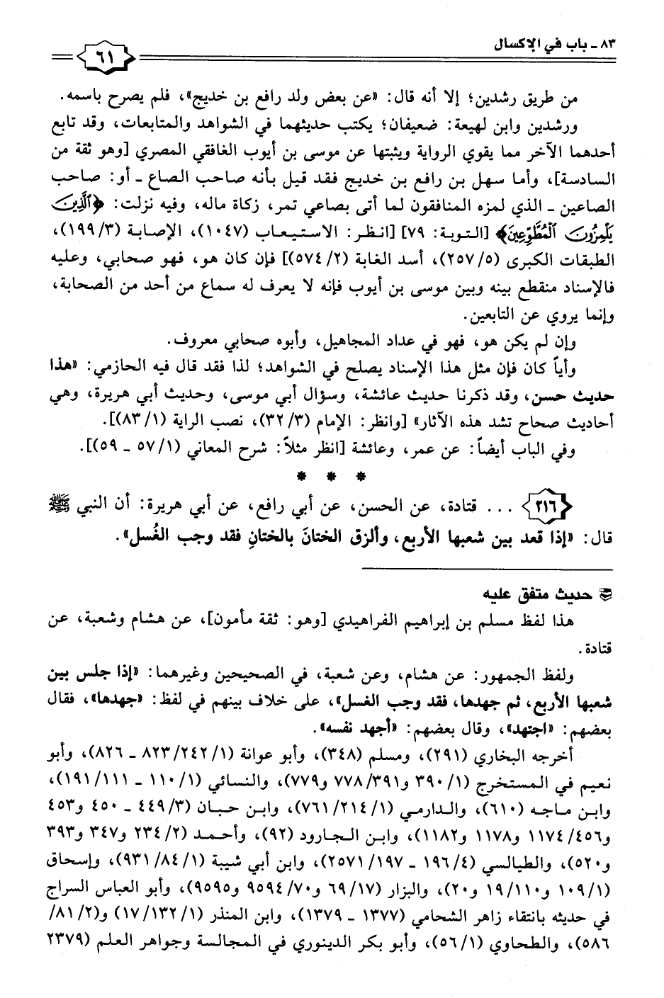 ٢١٦ - . . . قتادة، عن الحسن، عن أبي رافع، عن أبي هريرة: أن النبي - صلى الله عليه وسلم - قال: "إذا قعد بين شعبها الأربع، وألزق الختانَ بالختانِ فقد وجب الغُسل".