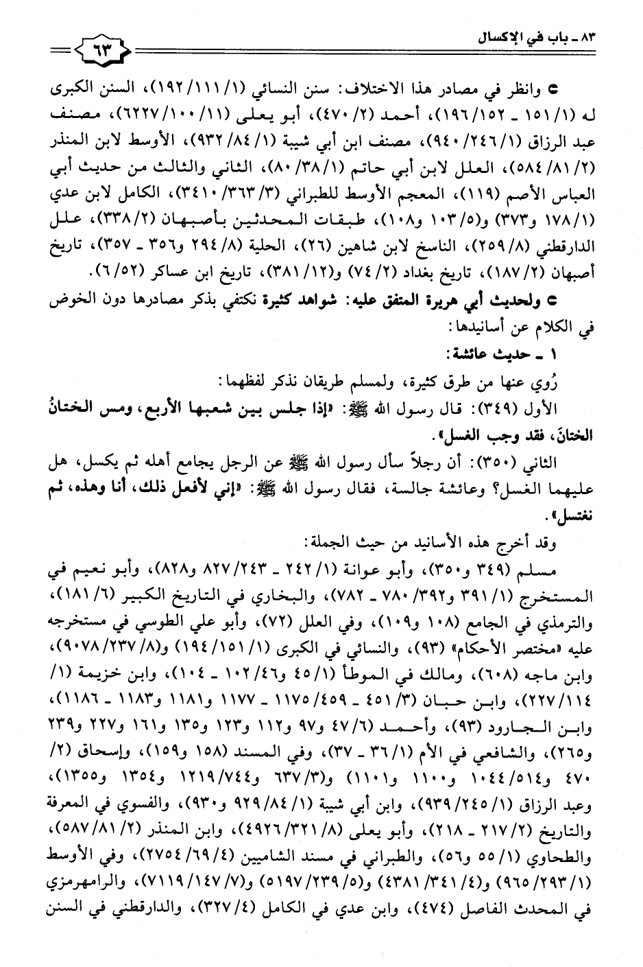 الثاني (٣٥٠): أن رجلًا سأل رسول الله - صلى الله عليه وسلم - عن الرجل يجامع أهله ثم يكسل، هل عليهما الغسل؟ وعائشة جالسة، فقال رسول الله - صلى الله عليه وسلم -: "إني لأفعل ذلك، أنا وهذه، ثم نغتسل".