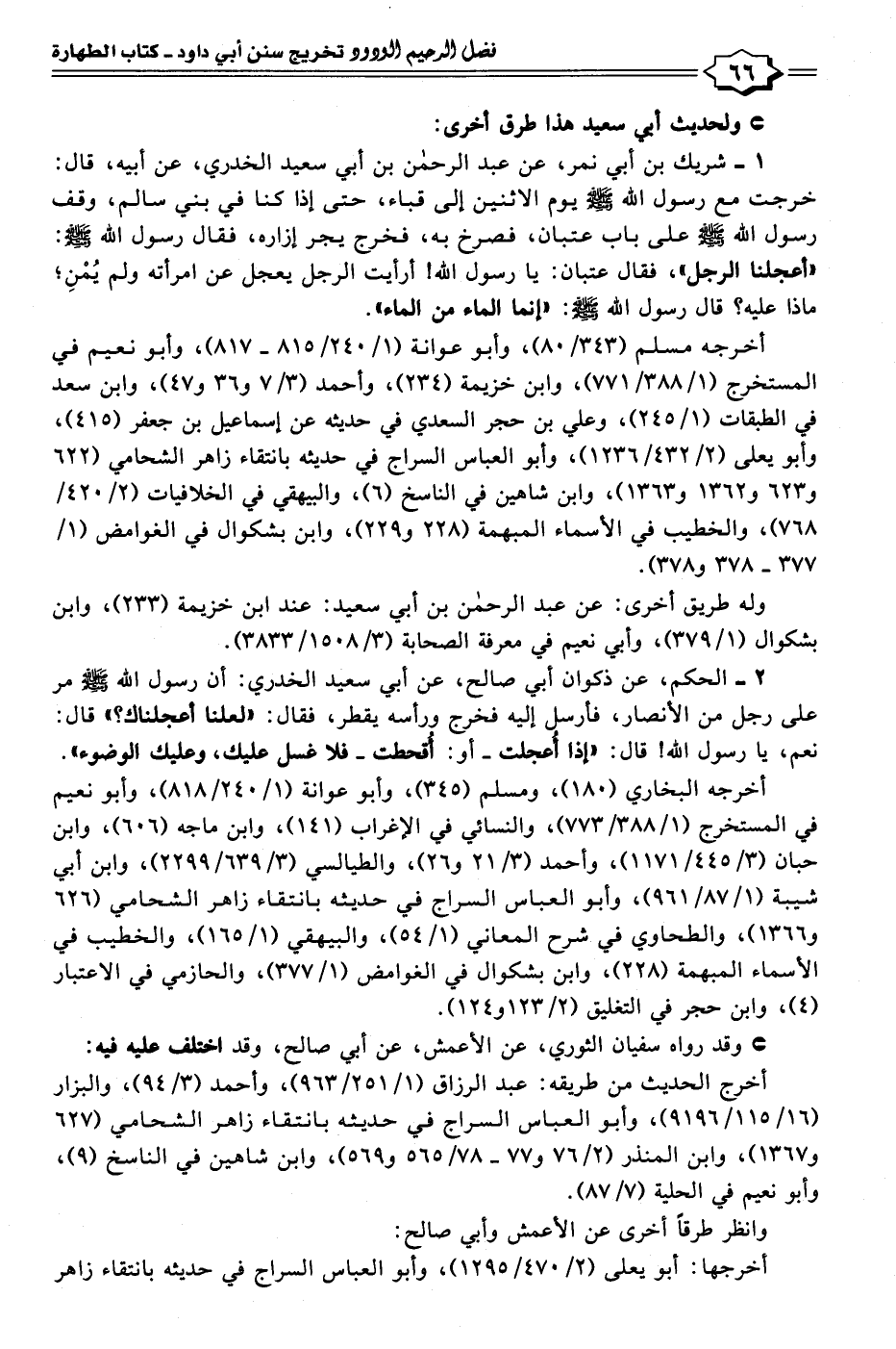 أخرجه البخاري (١٨٠)، ومسلم (٣٤٥)، وأبو عوانة (١/ ٢٤٠/ ٨١٨)، وأبو نعيم في المستخرج (١/ ٣٨٨/ ٧٧٣)، والنسائي في الإغراب (١٤١)، وابن ماجه (٦٠٦)، وابن حبان (٣/ ٤٤٥/ ١١٧١)، وأحمد (٣/ ٢١ و ٢٦)، والطيالسي (٣/ ٦٣٩/ ٢٢٩٩)، وابن أبي شيبة (١/ ٨٧/ ٩٦١)، وأبو العباس السراج في حديثه بانتقاء زاهر الشحامي (٦٢٦ و ١٣٦٦)، والطحاوي في شرح المعاني (١/ ٥٤)، والبيهقي (١/ ١٦٥)، والخطيب في الأسماء المبهمة (٢٢٨)، وابن بشكوال في الغوامض (١/ ٣٧٧)، والحازمي في الاعتبار (٤)، وابن حجر في التغليق (٢/ ١٢٣ و ١٢٤).