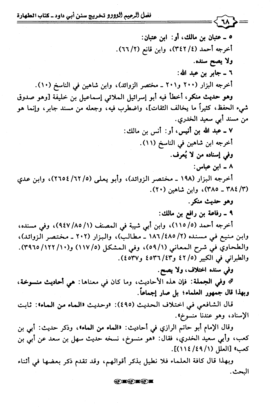 وقال الإمام أبو حاتم الرازي في أحاديث: "الماء من الماء"، وذكر حديث: أبي بن كعب، وأبي سعيد الخدري، فقال: "هو منسوخ، نسخه حديث سهل بن سعد عن أبي بن كعب" [العلل (١/ ٤٩/ ١١٤)].