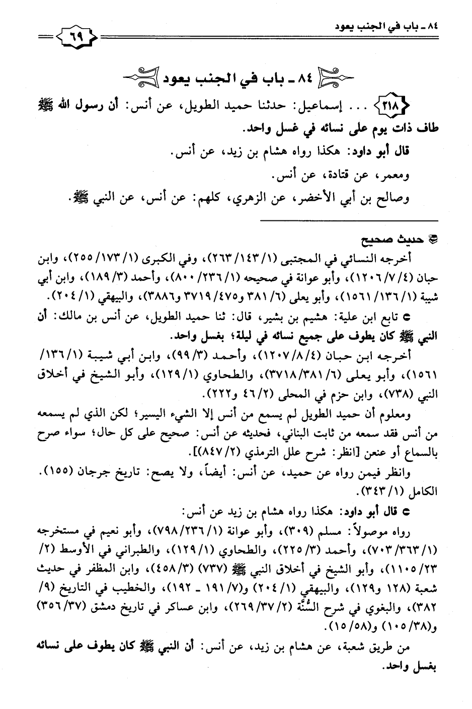 • تابع ابن علية: هشيم بن بشير، قال: ثنا حميد الطويل، عن أنس بن مالك: أن النبي - صلى الله عليه وسلم - كان يطوف على جميع نسائه في ليلة؛ بغسل واحد.