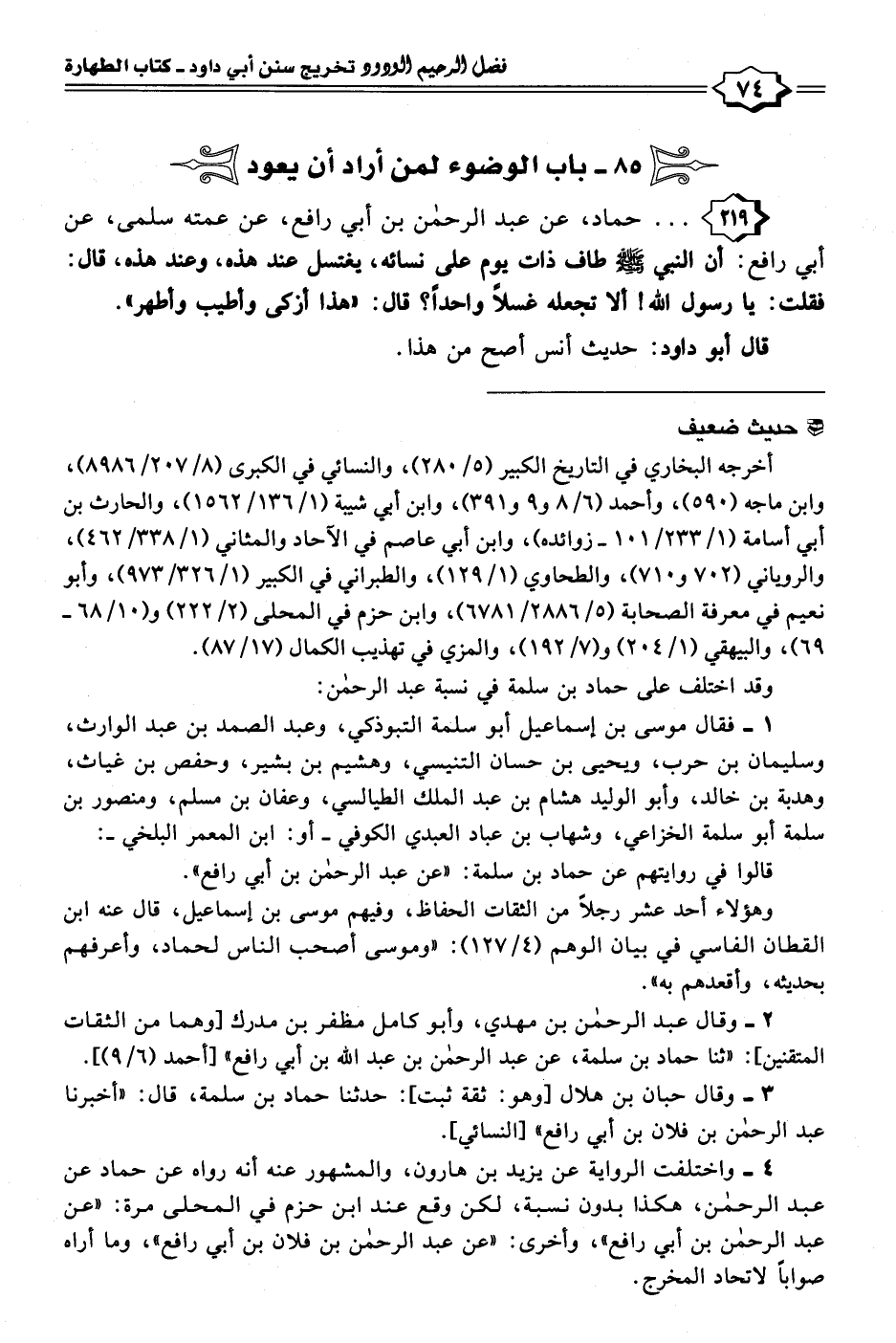 ٤ - واختلفت الرواية عن يزيد بن هارون، والمشهور عنه أنه رواه عن حماد عن عبد الرحمن، هكذا بدون نسبة، لكن وقع عند ابن حرم في المحلى مرة: "عن عبد الرحمن بن أبي رافع"، وأخرى: "عن عبد الرحمن بن فلان بن أبي رافع"، وما أراه صوابًا لاتحاد المخرج.