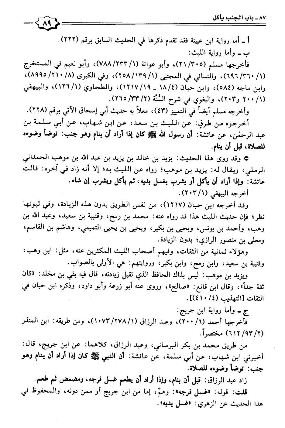 من طريق محمد بن بكر البرساني، وعبد الرزاق، كلاهما: عن ابن جريج، قال: أخبرني ابن شهاب، عن أبي سلمة، عن عائشة: أن النبي - صلى الله عليه وسلم - كان إذا أراد أن ينام وهو جنب: توضأ وضوءه للصلاه.