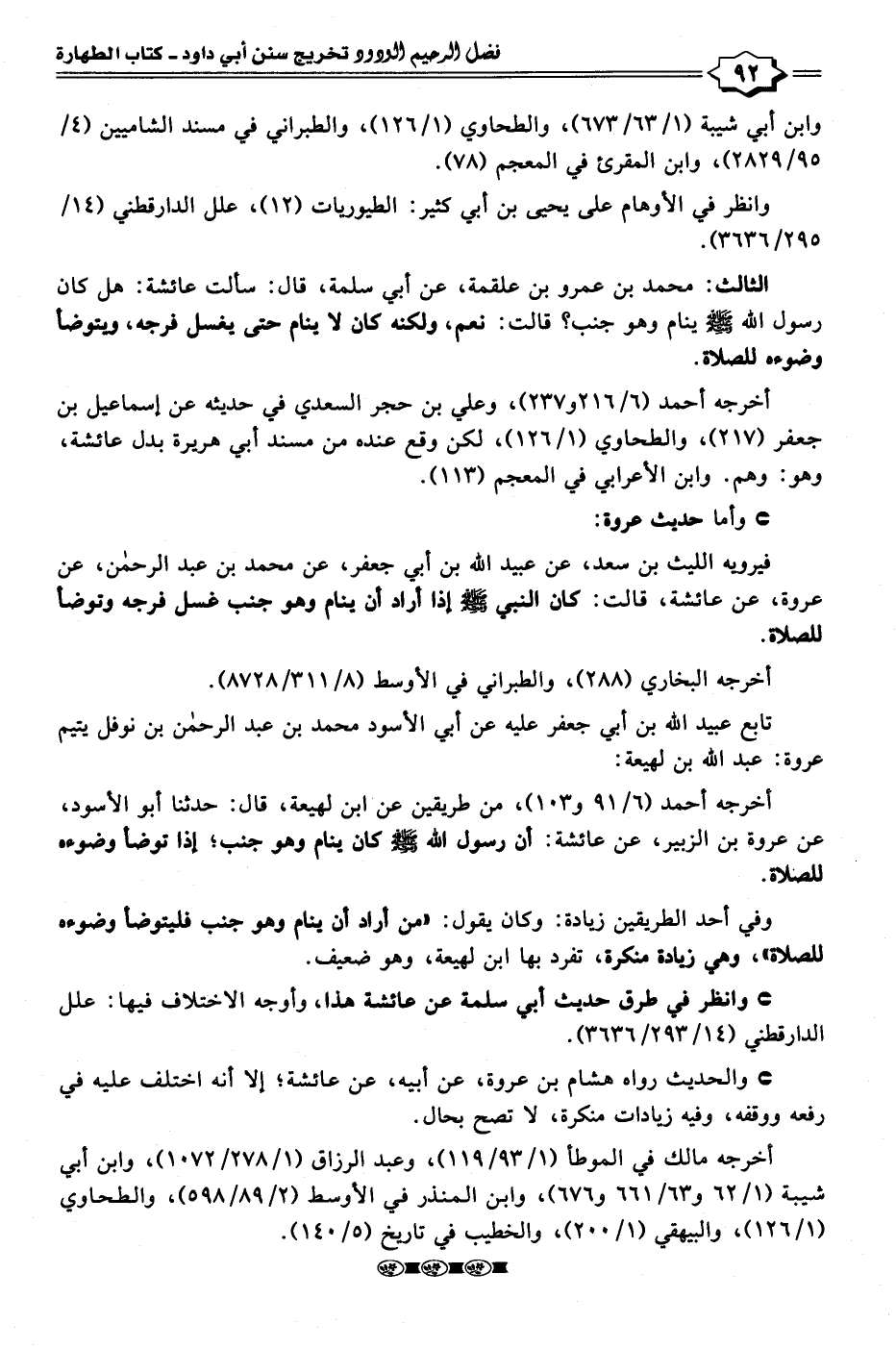 الثالث: محمد بن عمرو بن علقمة، عن أبي سلمة، قال: سألت عائشة: هل كان رسول الله - صلى الله عليه وسلم - ينام وهو جنب؟ قالت: نعم، ولكنه كان لا ينام حتى يغسل فرجه، ويتوضأ وضوءه للصلاة.
