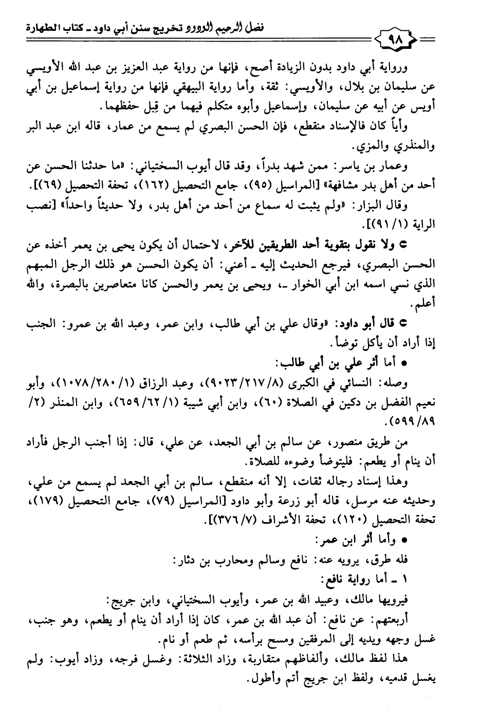 • قال أبو داود: "وقال علي بن أبي طالب، وابن عمر، وعبد الله بن عمرو: الجنب إذا أراد أن يأكل توضأ.
