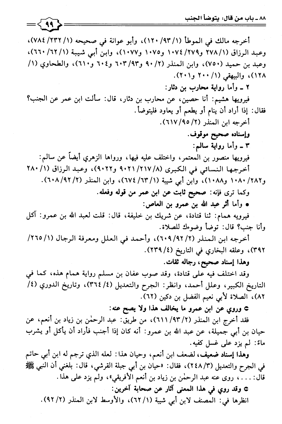 فيرويها هشيم: أنا حصين، عن محارب بن دثار، قال: سألت ابن عمر عن الجنب؟