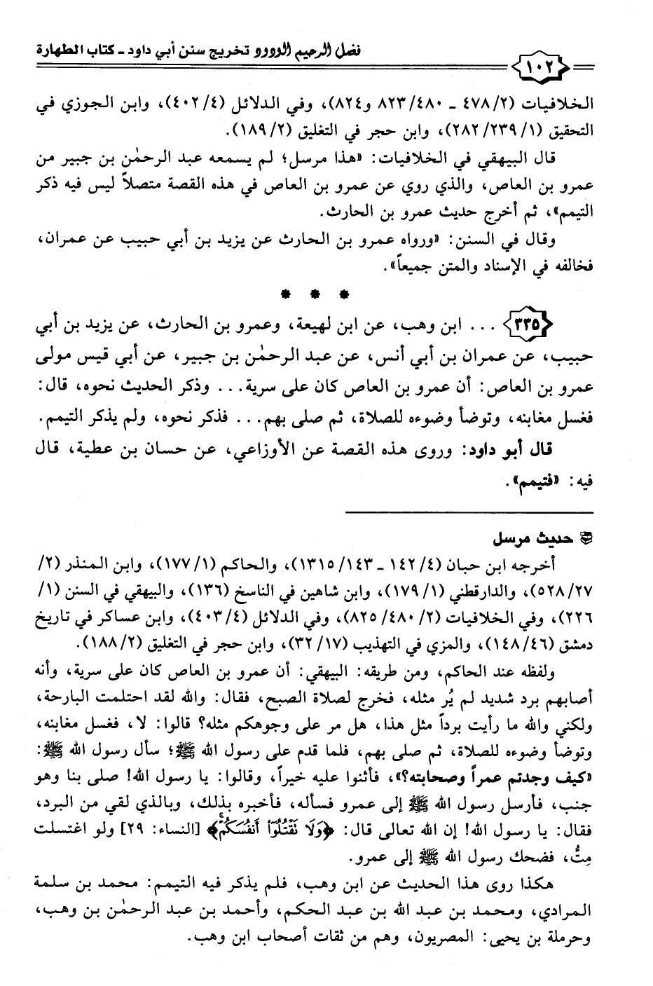 ٣٣٥ - ابن وهب، عن ابن لهيعة، وعمرو بن الحارث، عن يزيد بن أبي حبيب، عن عمران بن أبي أنس، عن عبد الرحمن بن جبير، عن أبي قيس مولى عمرو بن العاص: أن عمرو بن العاص كان على سرية. . . وذكر الحديث نحوه، قال: فغسل مغابنه، وتوضأ وضوءه للصلاة، ثم صلى بهم. . . فذكر نحوه، ولم يذكر التيمم.